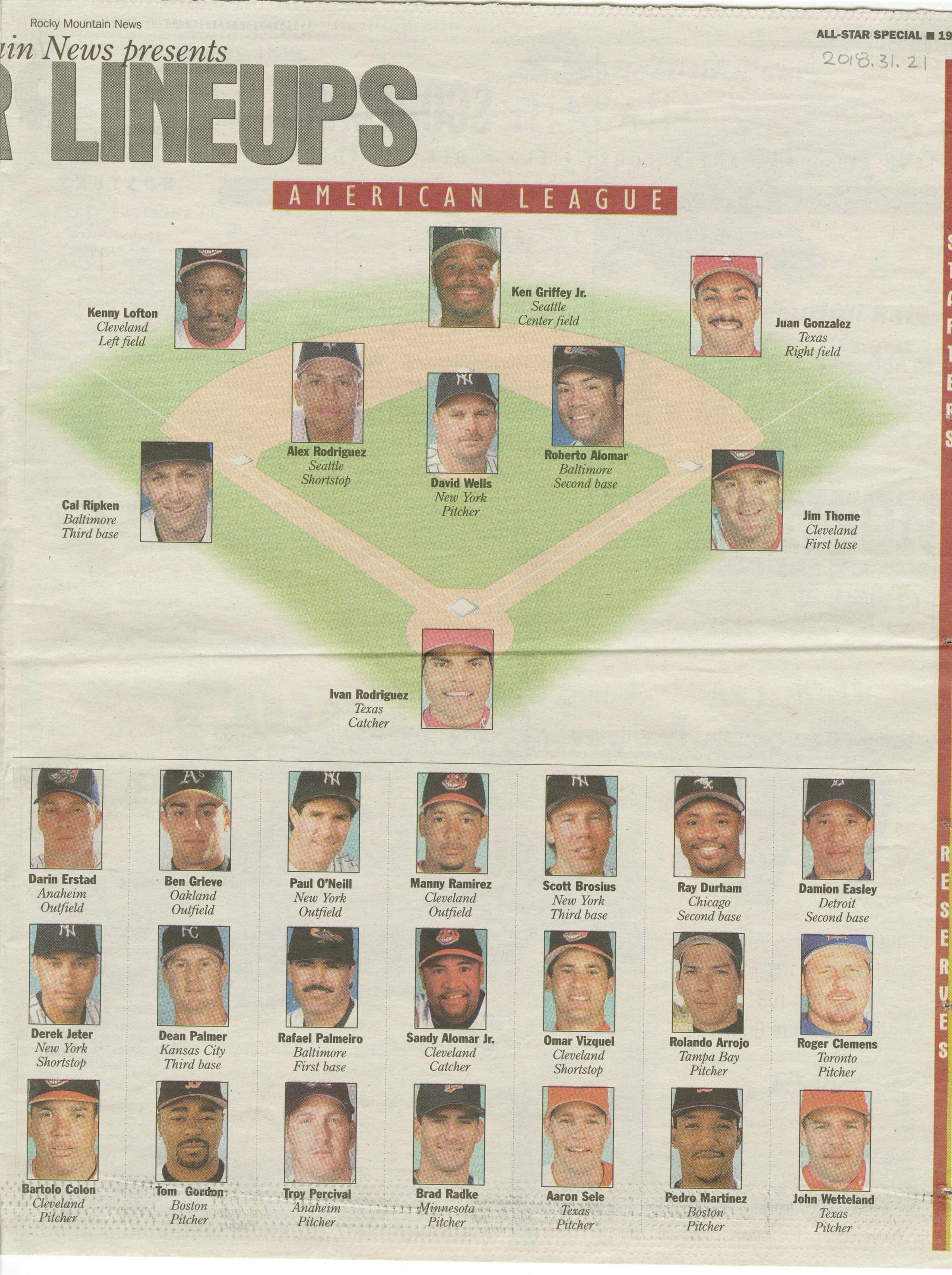 Single page from the Rocky Mountain News from July 7, 1998 showing the All-Star Lineups for the National and American Leagues.Collection
