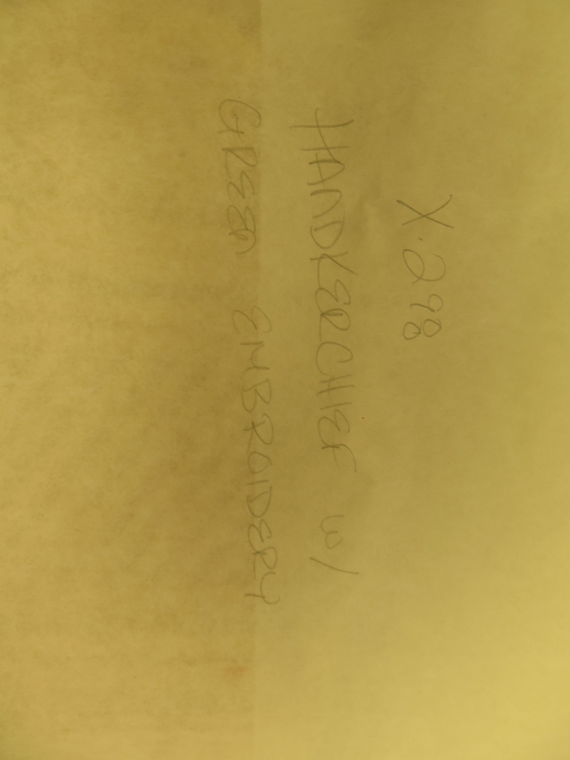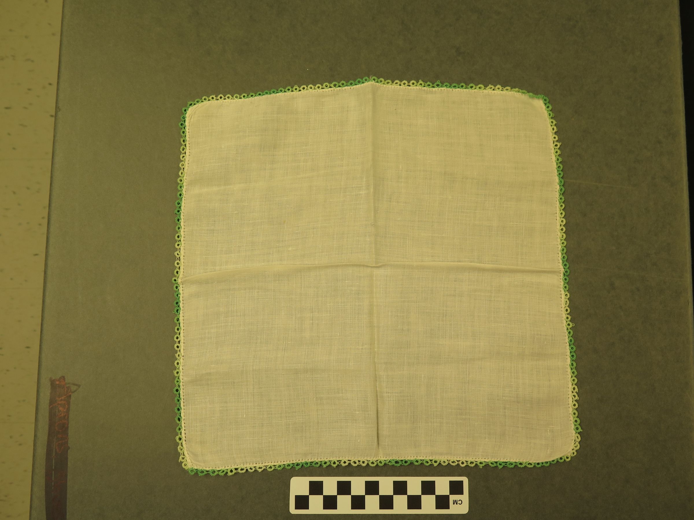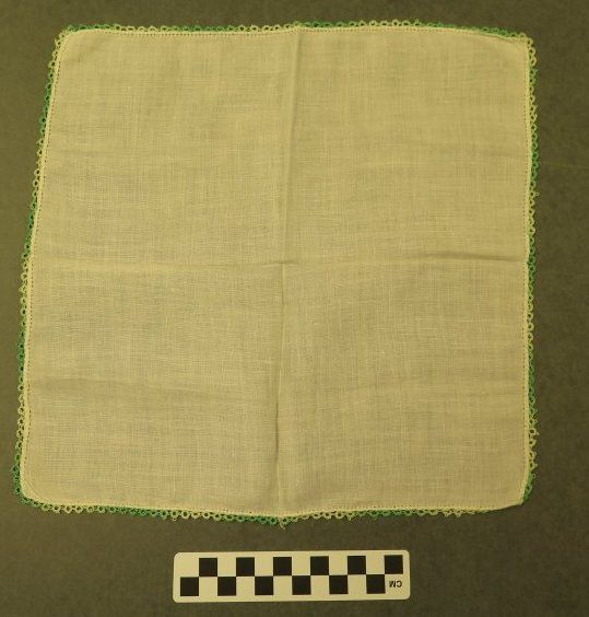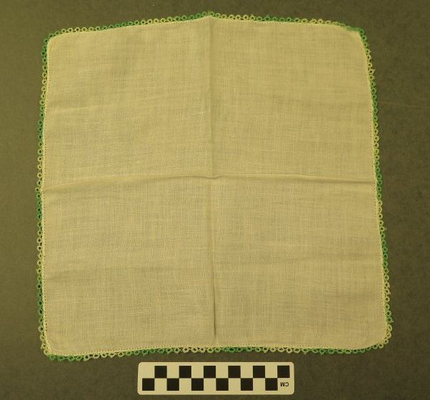 This is a white linen handkerchief with green embroidery as trim. The handkerchief measures 12" (w) x 12" (l).