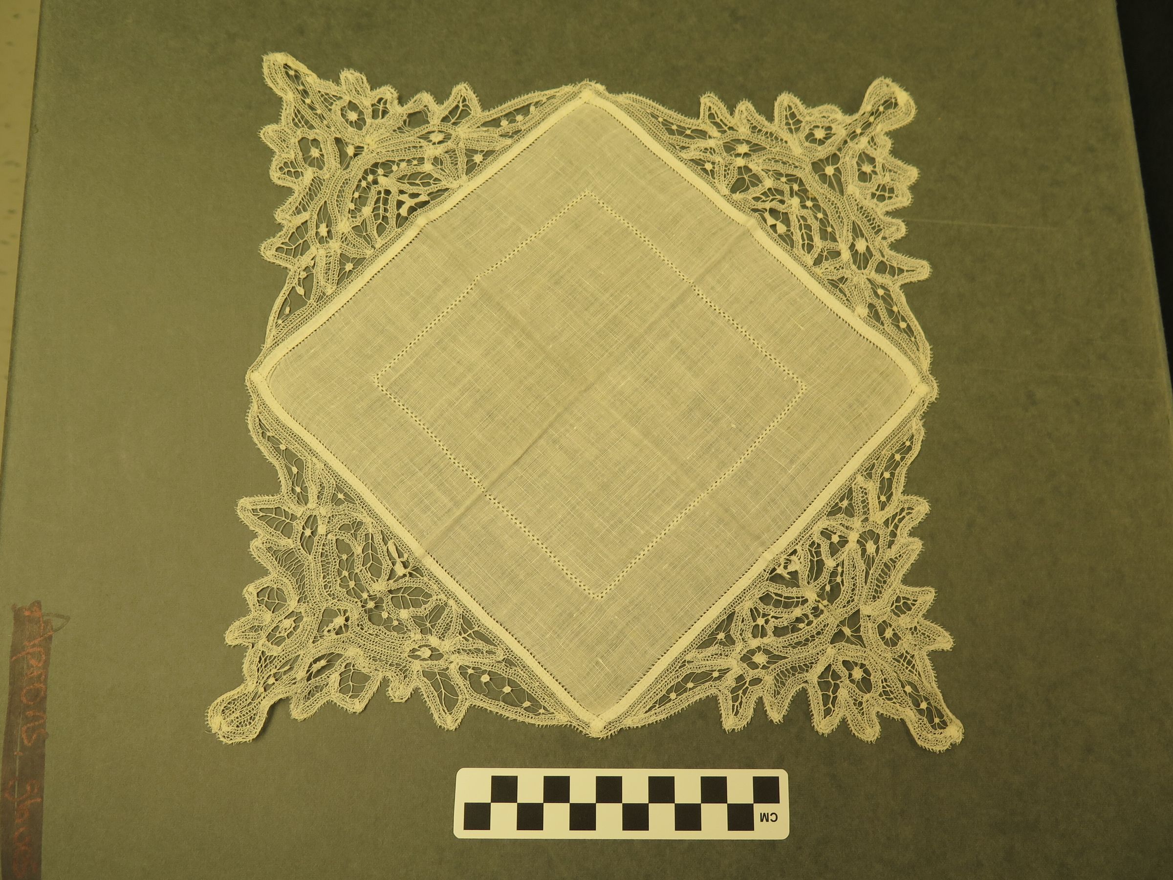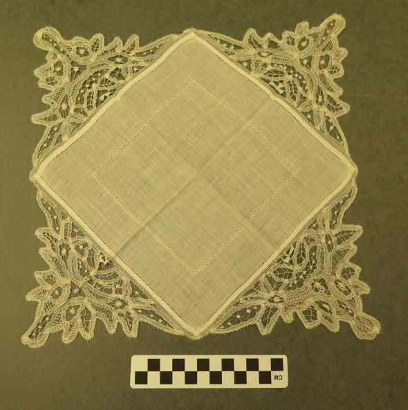 This is a white linen furniture scarf with crocheted triangle edges. The furniture scarf measures 15.75" (w) x 15.75" (l).