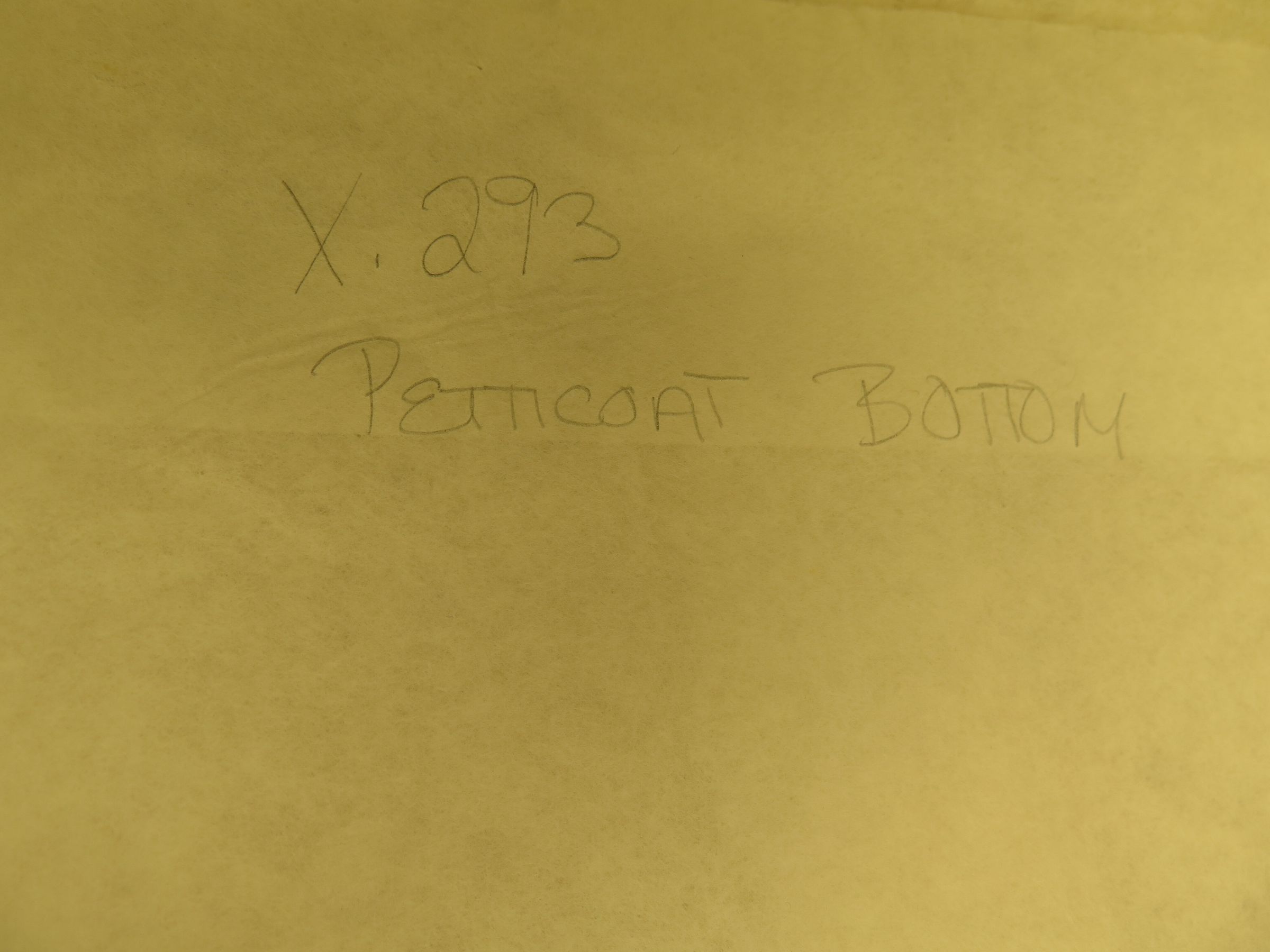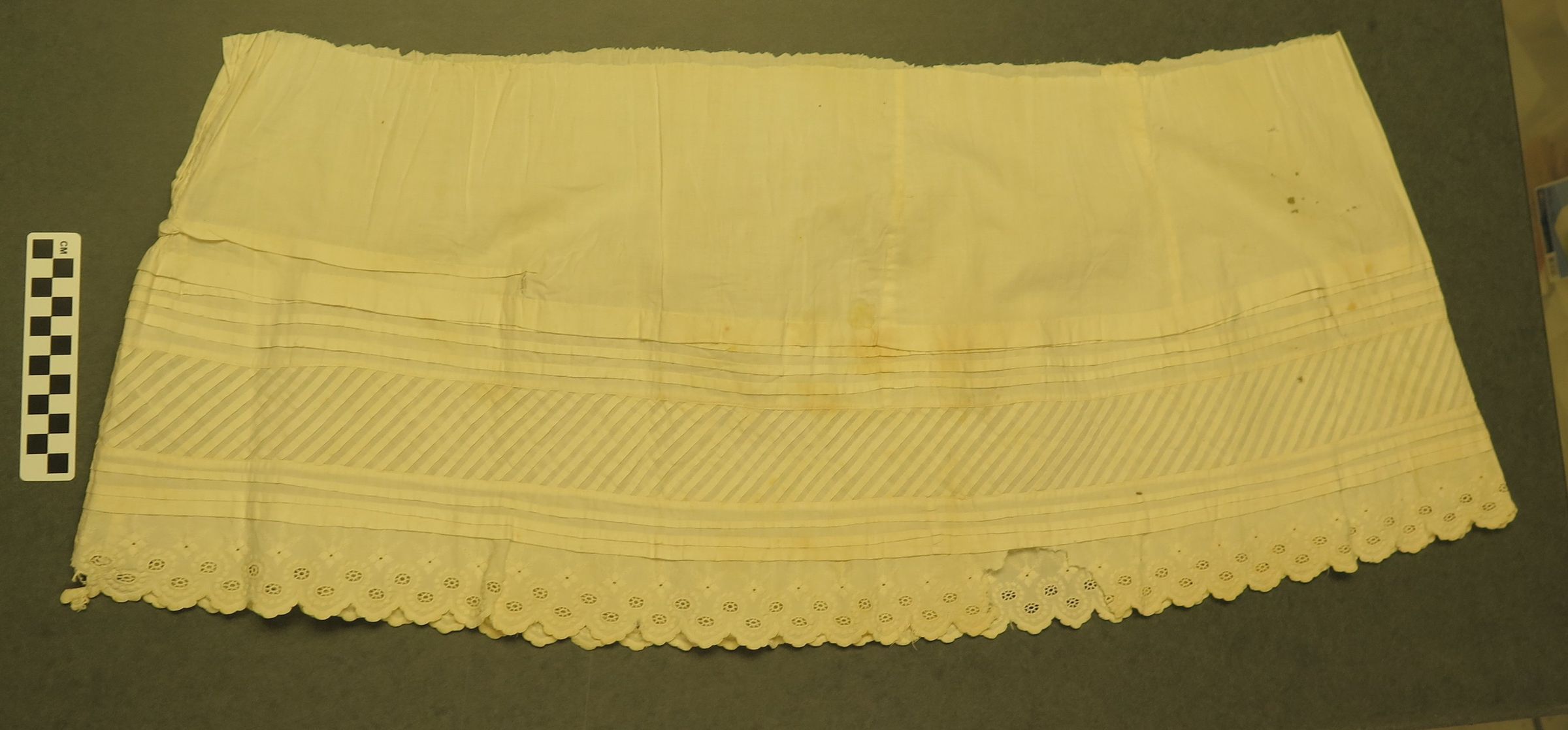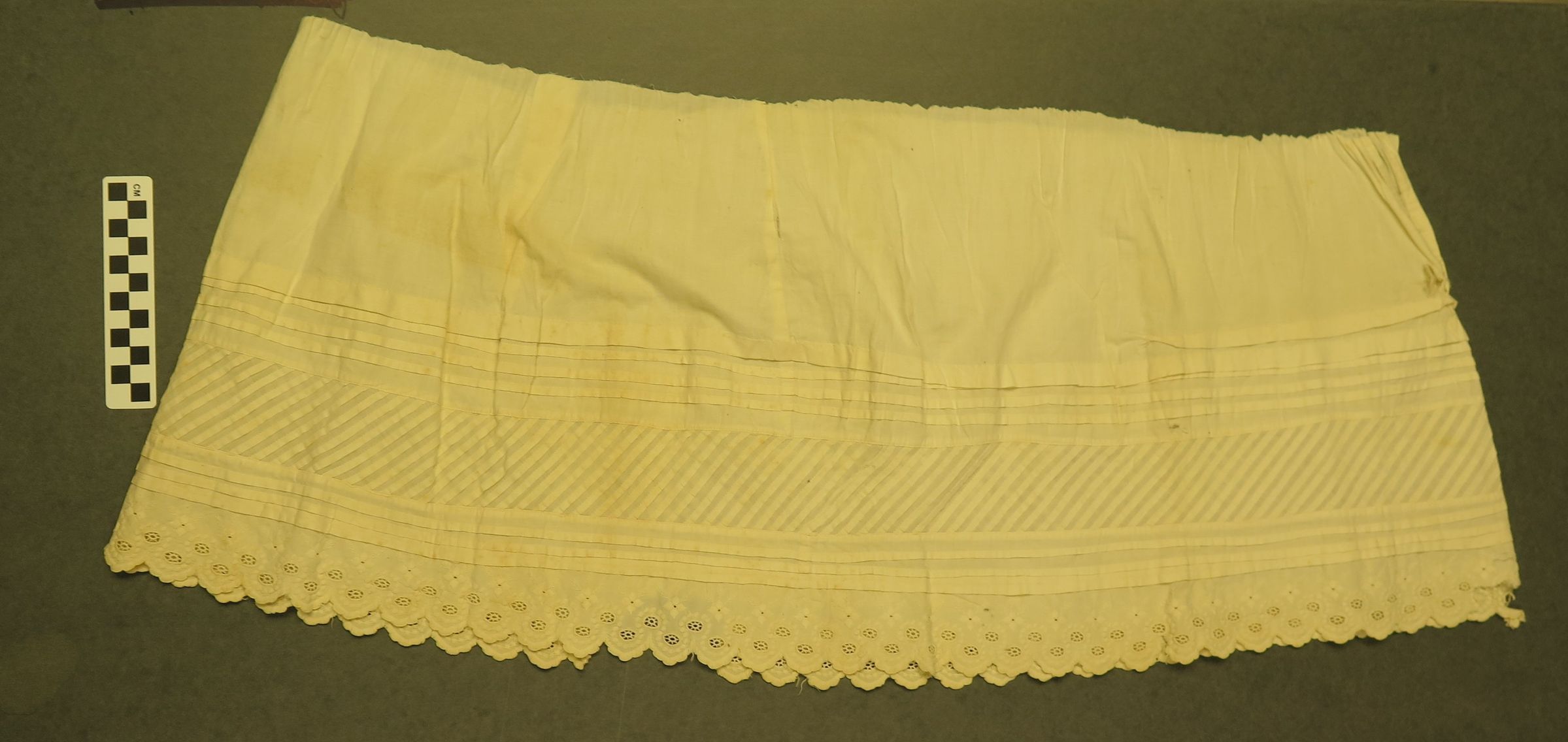 This is the bottom potion of a white petticoat. The petticoat is stained, has moth holes in it, and has a slit near the top. The petticoat bottom measurers 12.75" (w) x 29" (diam).