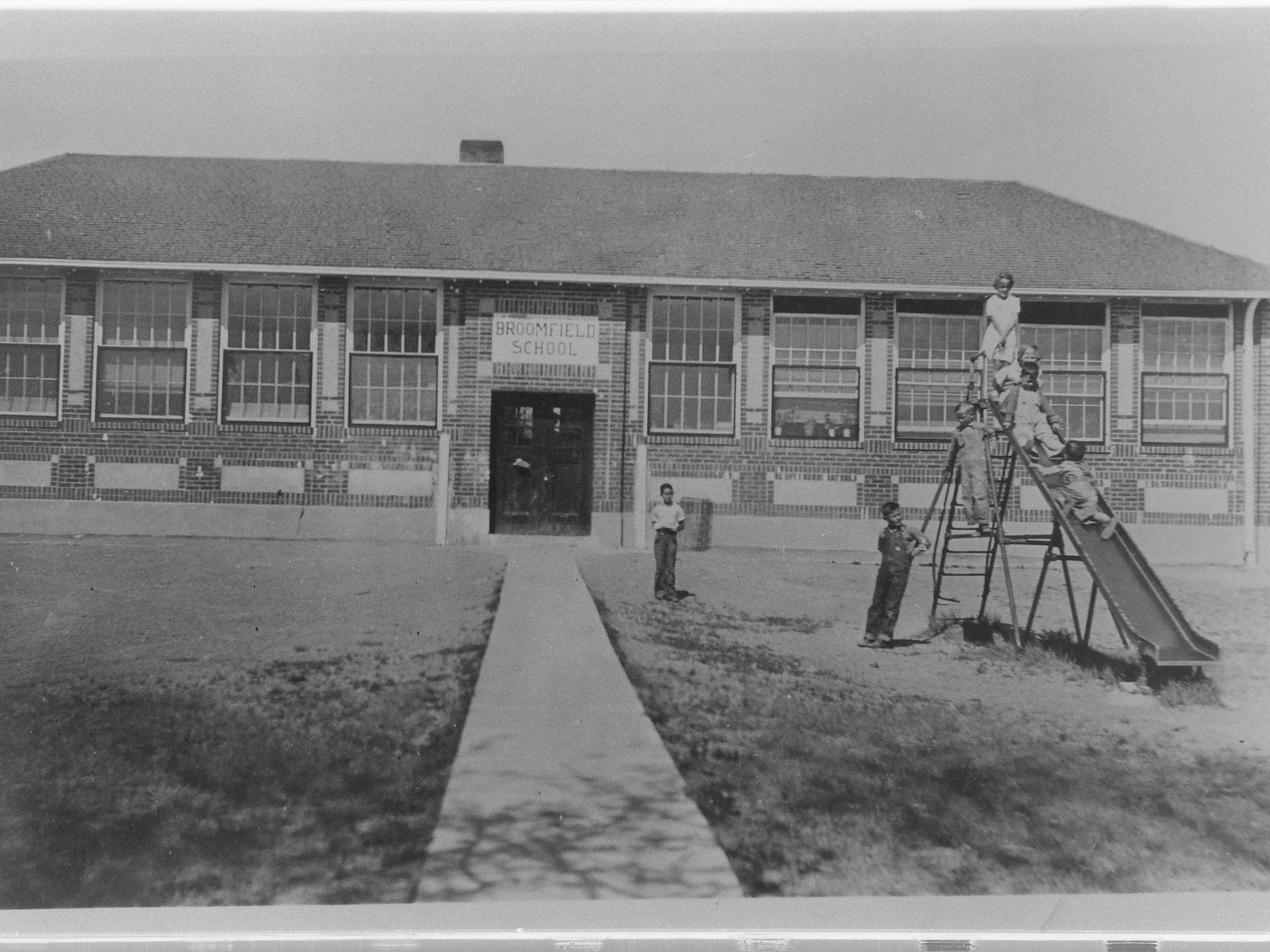 Broomfield School in District #43 of Boulder County in 1930s. It is a black and white photo of a school house in the background saying "Broomfield School". In the front are 6 children with 4 of them on a slide. The paper that came with the donations said the kids were "Phyllis Dunphy. Small boys are David and Dale Shaklee. Others are Bill Mathews, Lynn Dunphy and Gordon Shaklee."