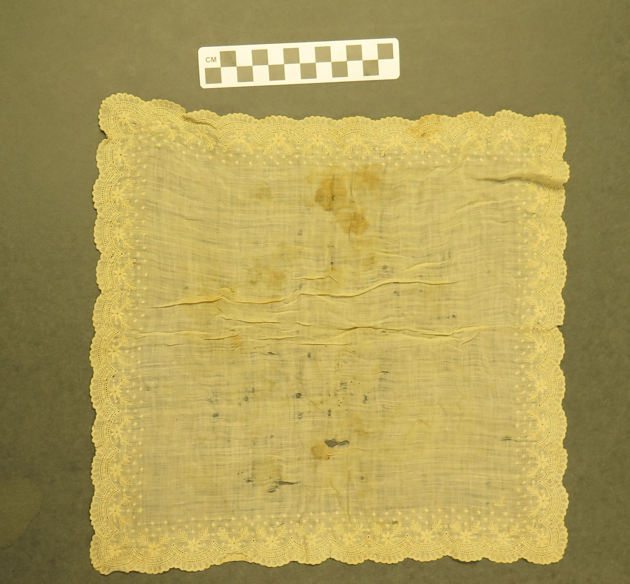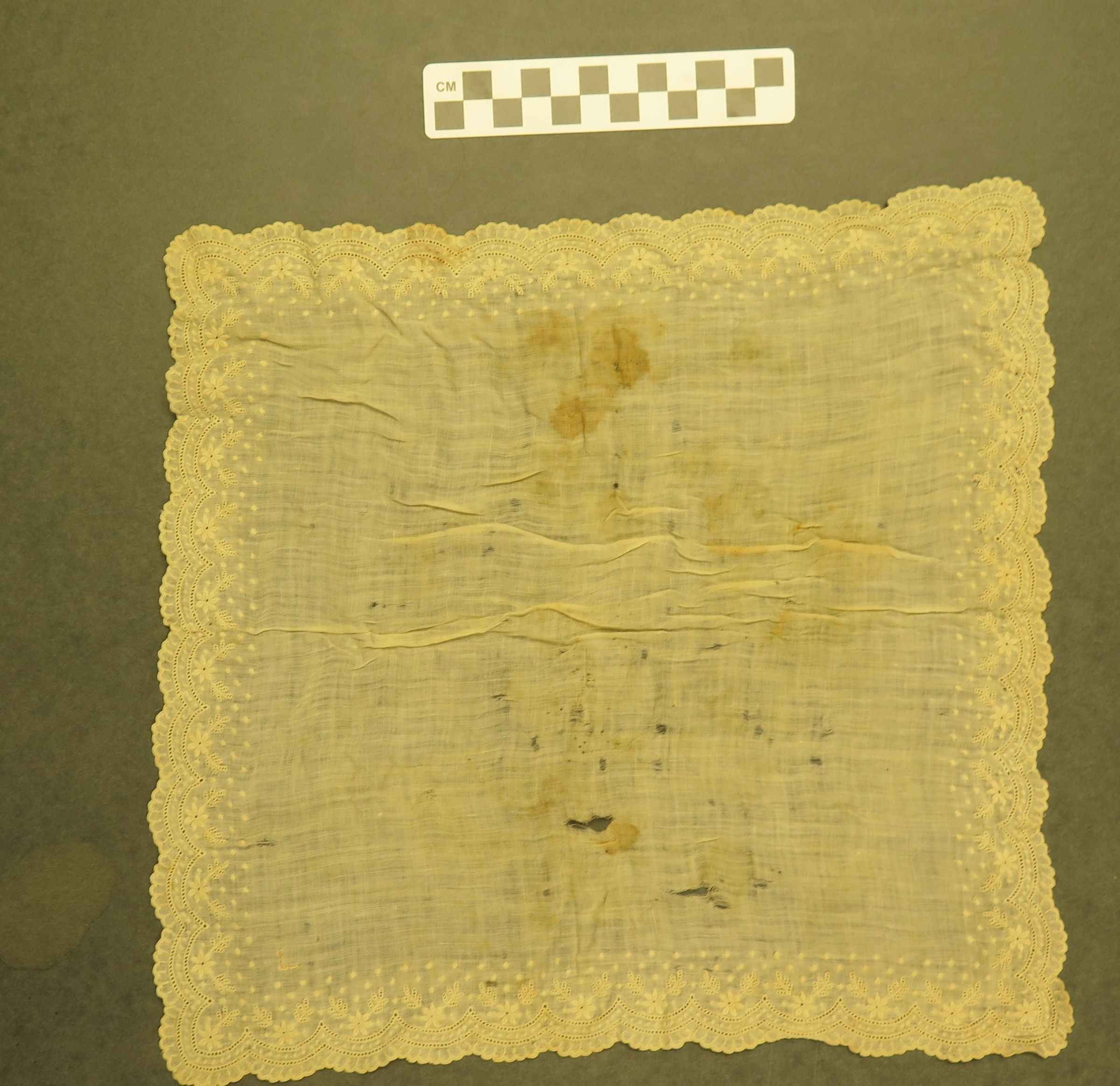 This is a white linen handkerchief with a embroidered trim. The handkerchief as many brown stains and holes in it. The handkerchief measures 11.5" (w) x 11.5" (l).