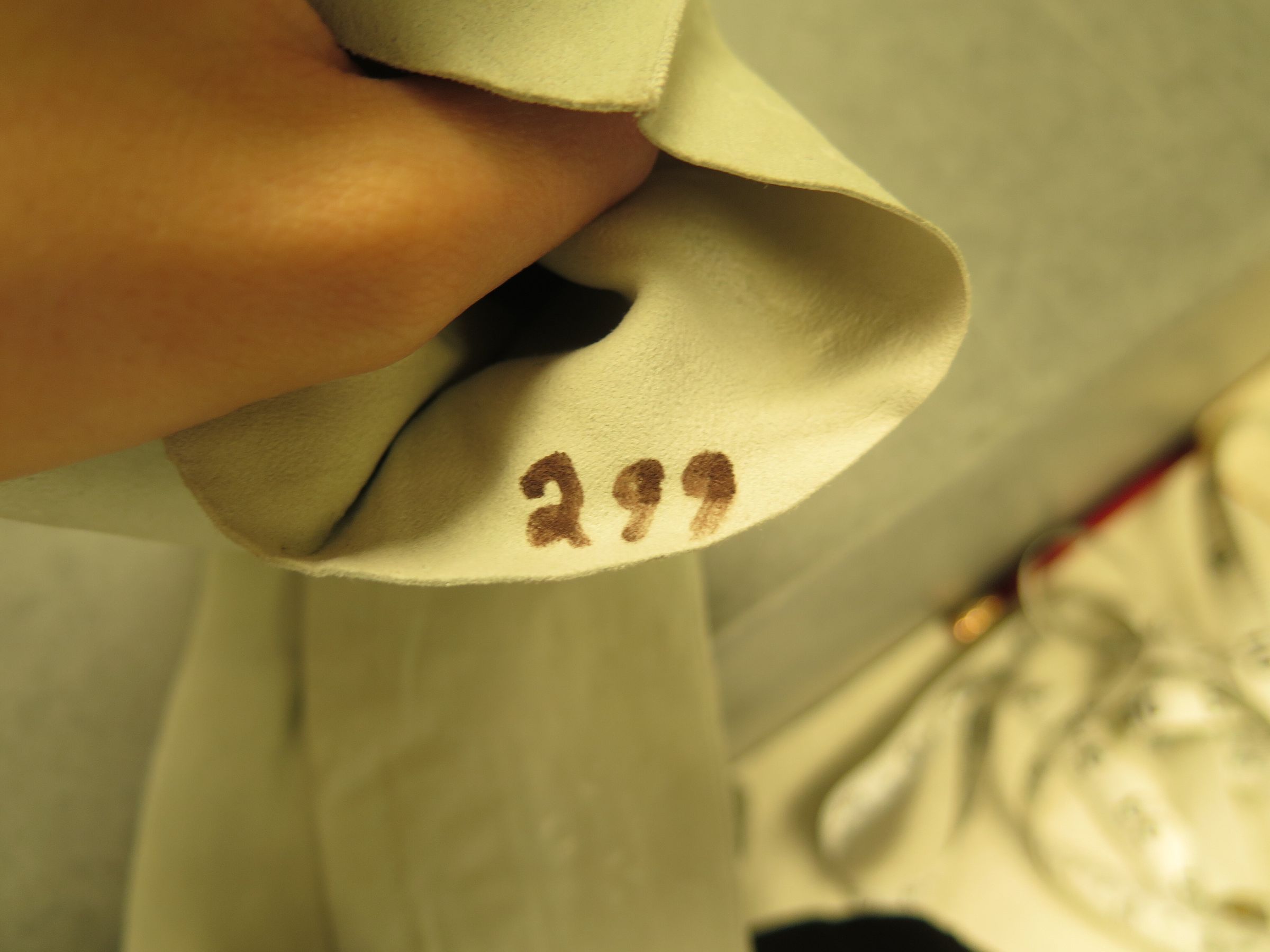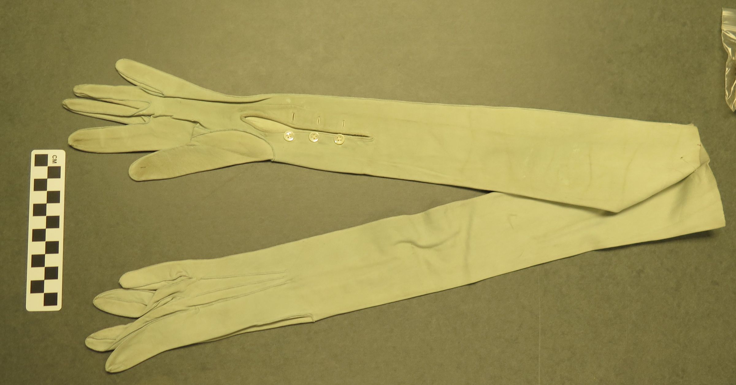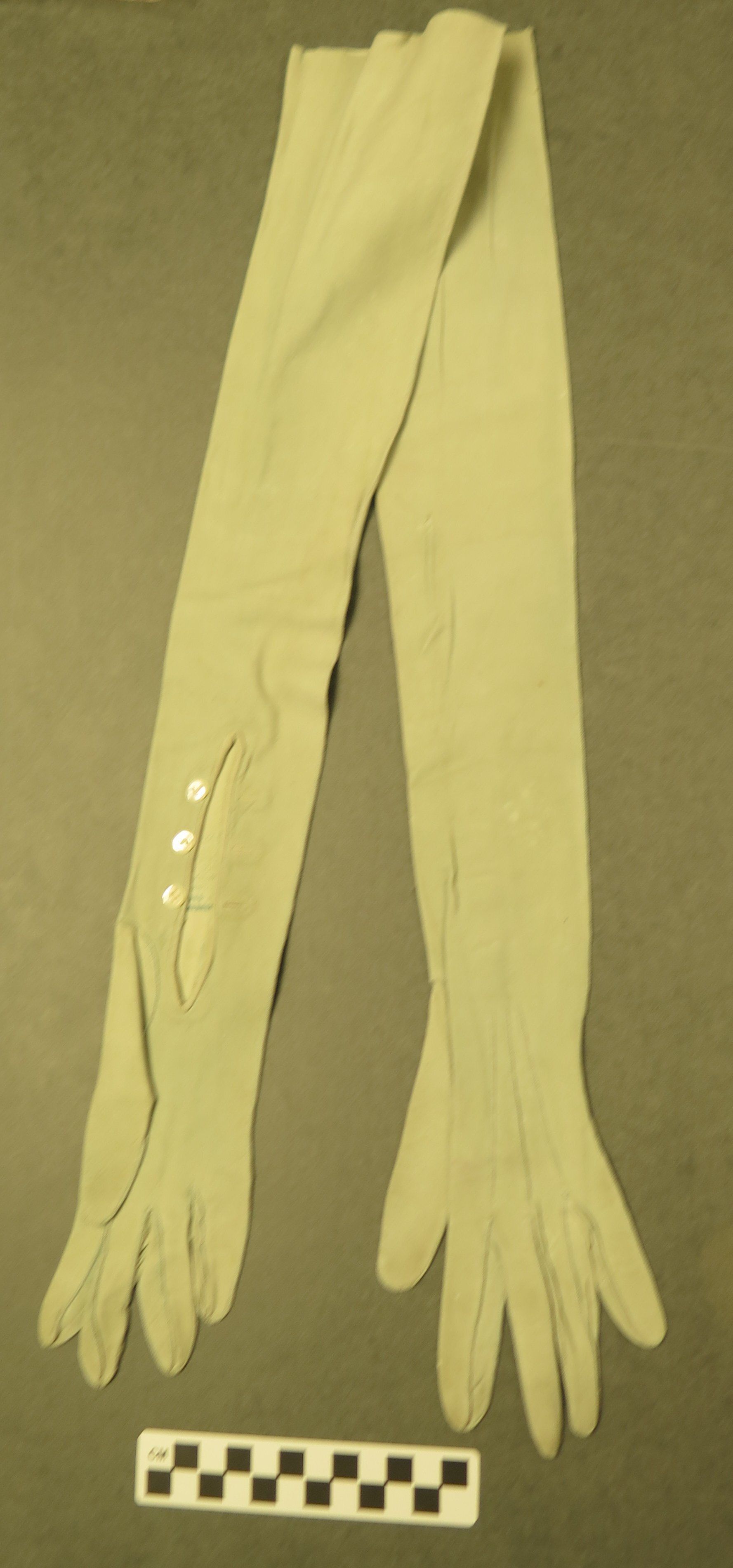 This is a pair of aqua blue leather elbow length gloves. There are 3 white plastic buttons on the inside of the wrists. The gloves were made in France. The gloves each measure 4" (w) x 22" (l).