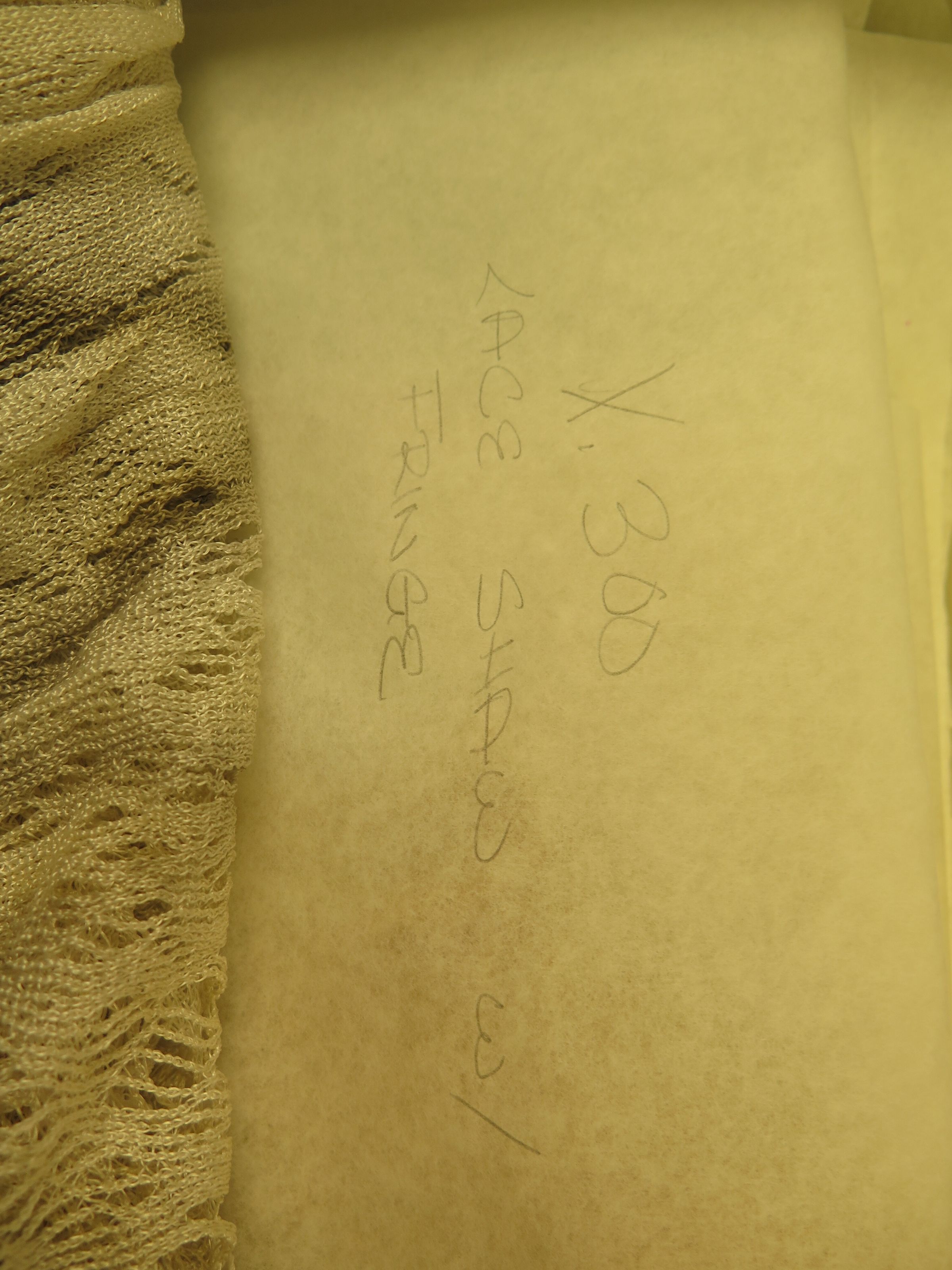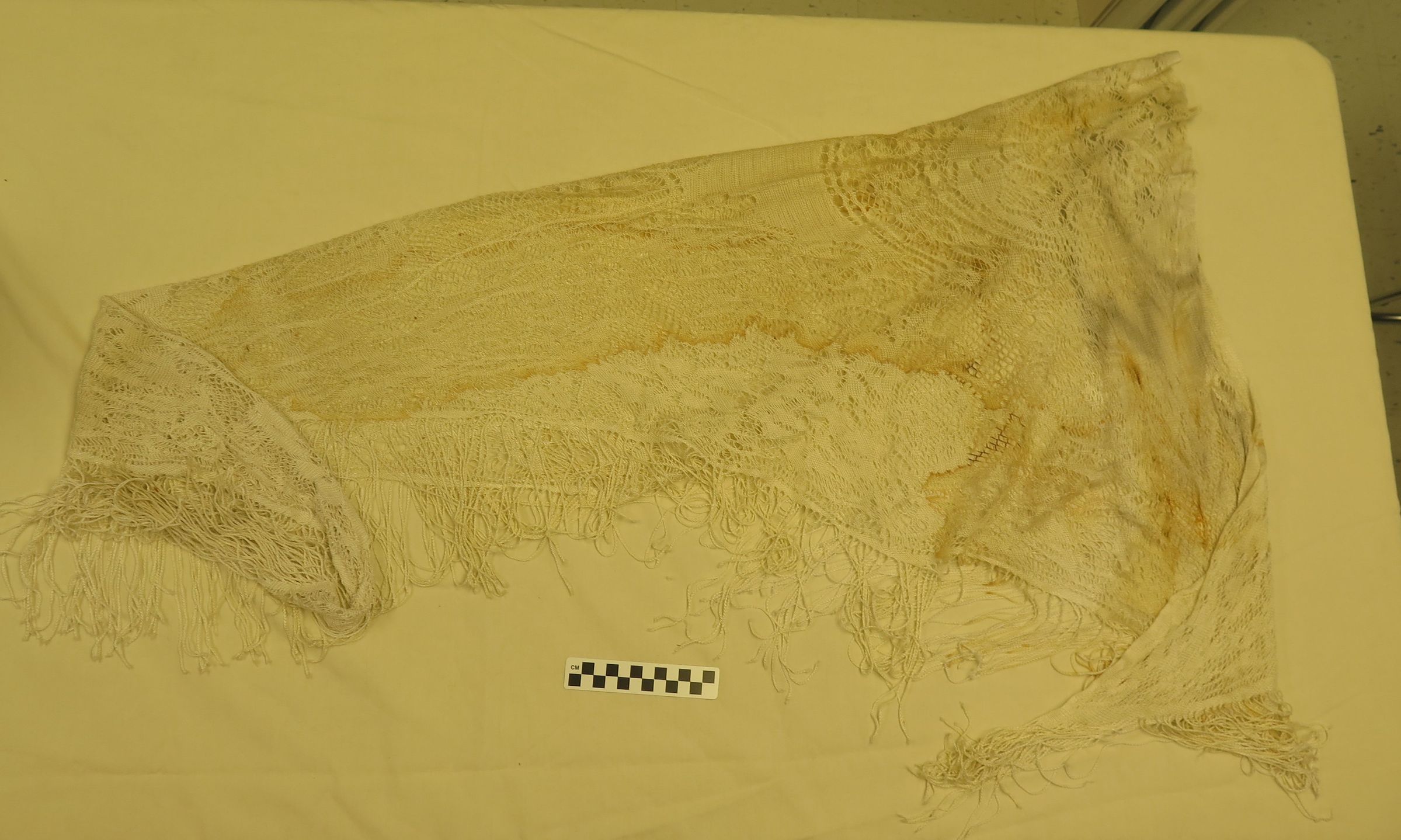 This is a lace furniture scarf or shawl with fringe. It is heavily stained both brown and grey. The furniture scarf measures 60" (w) x 40" (l).