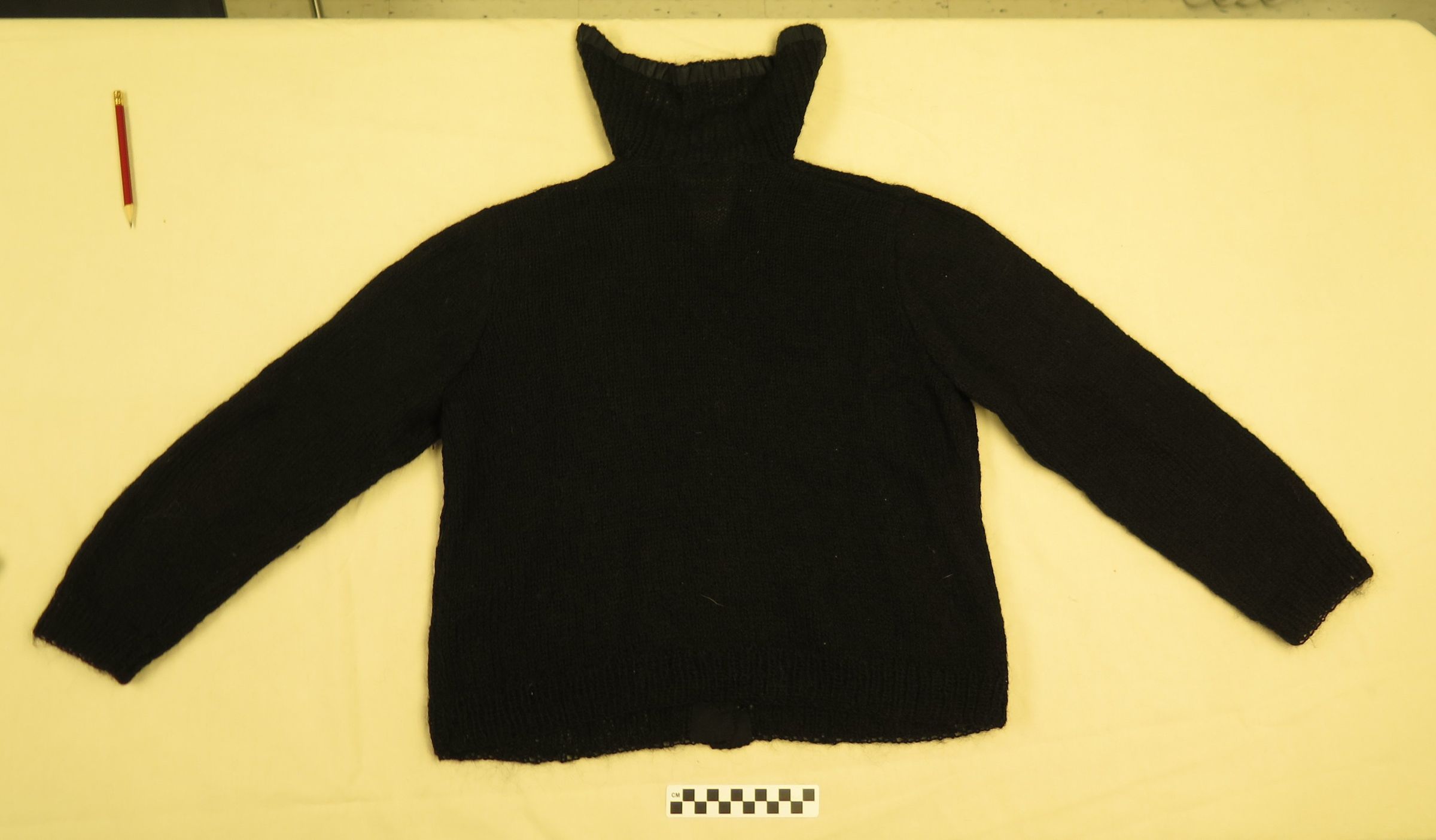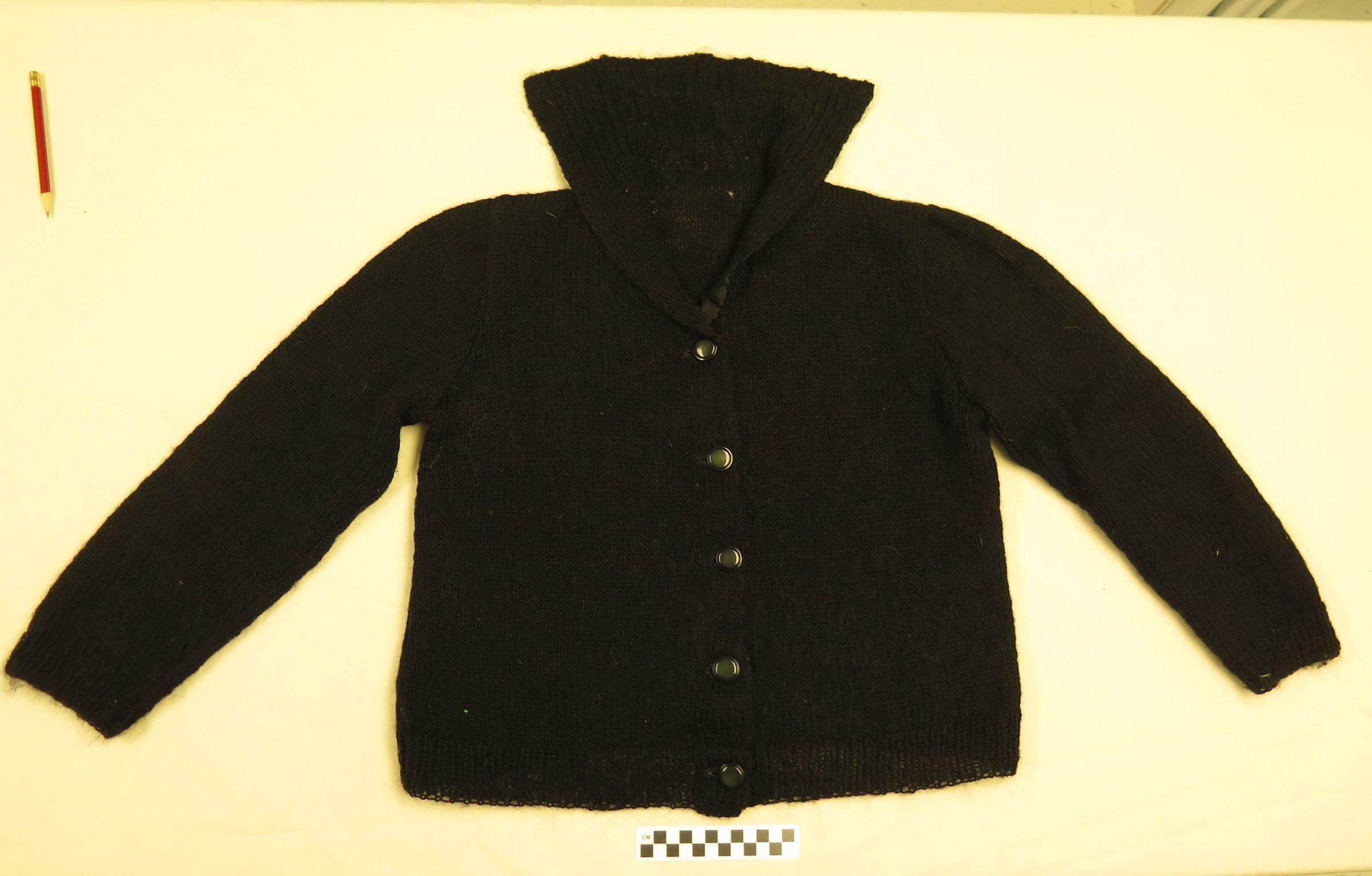 This is a black wool sweater with 5 buttons down the front. The sweater has a shawl collar. The sweater does not have a tag, and is likely handmade. The sweater measures 19" (w) x 25.5" (l).
