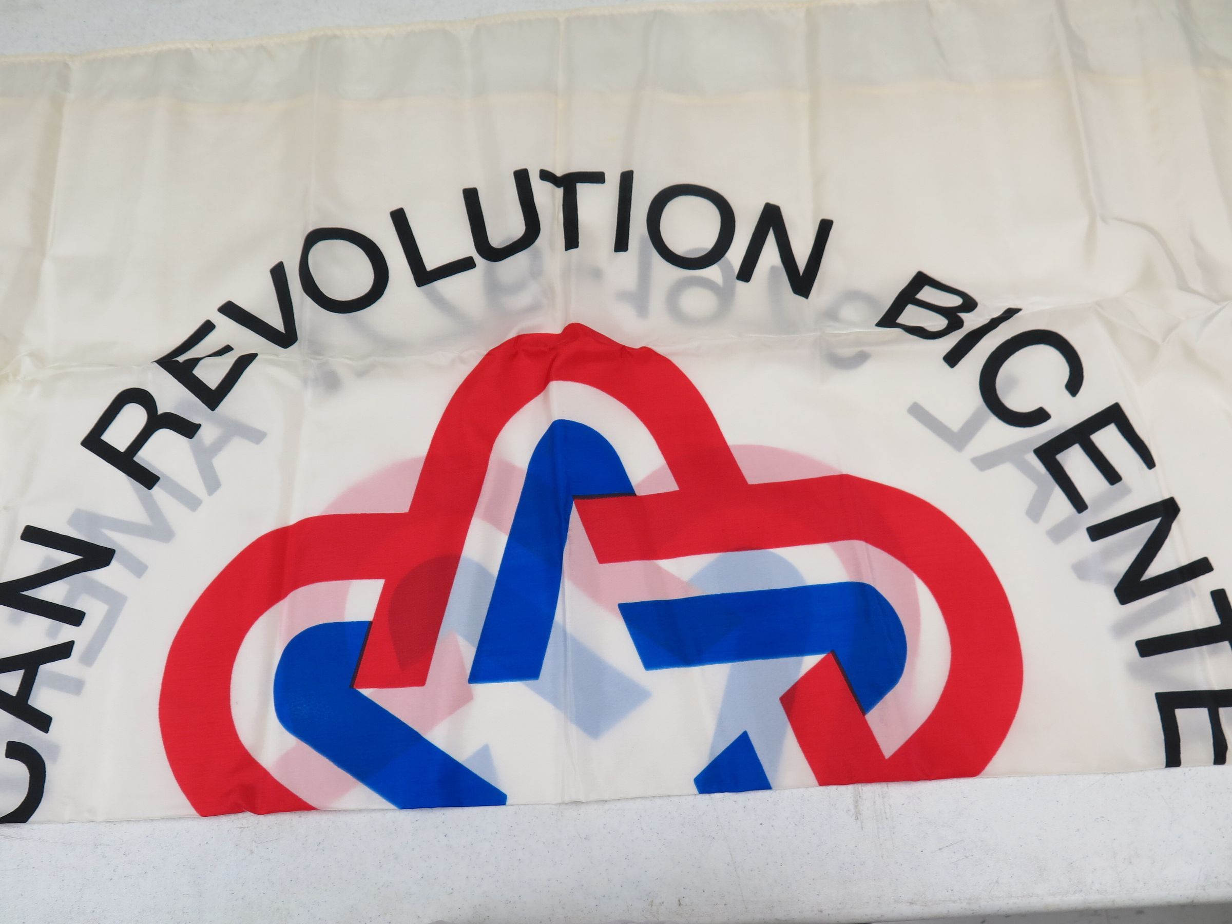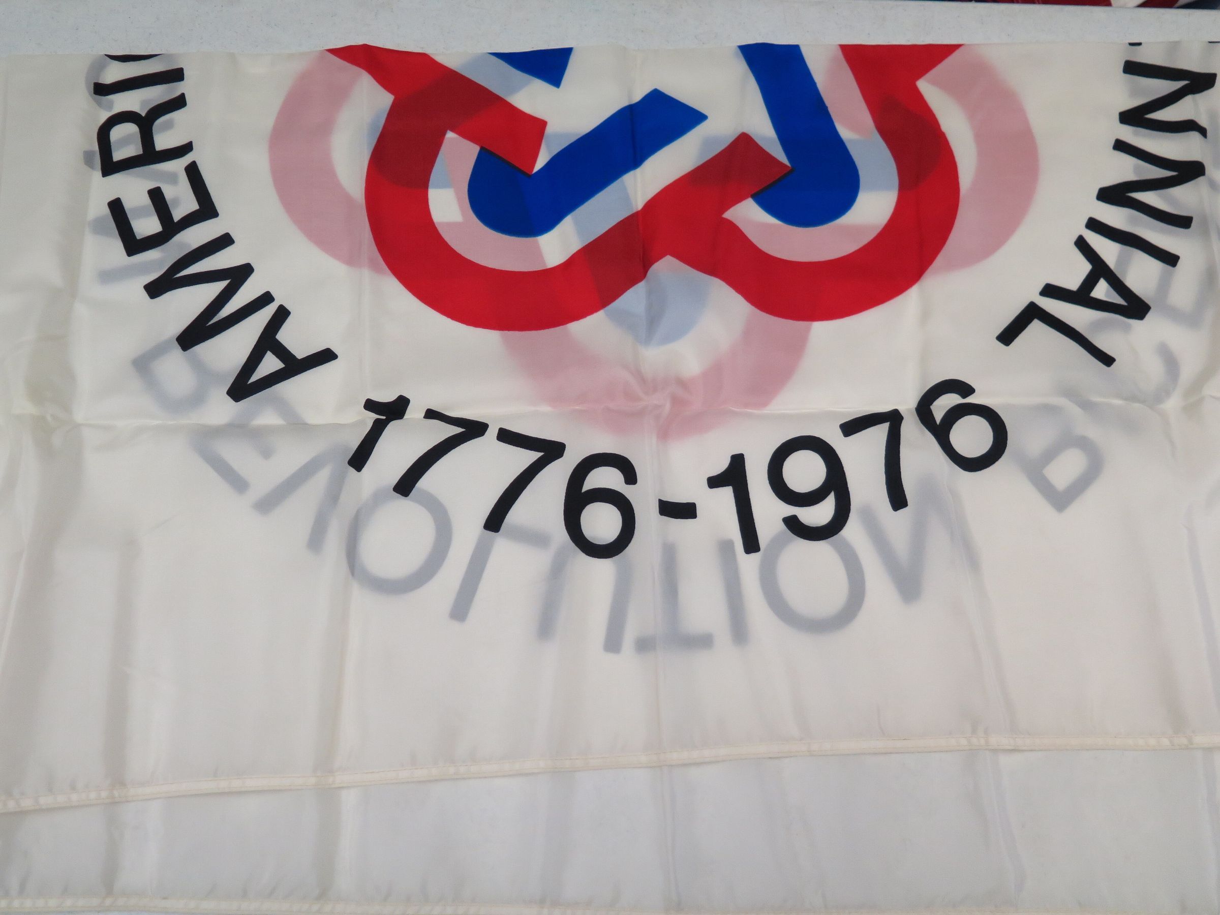This is a 100% nylon flag commemorating the bicentennial on the American Revolution. The flag has a white background with a red and blue logo in the center. The flag measures 48" (w) x 72" (l).