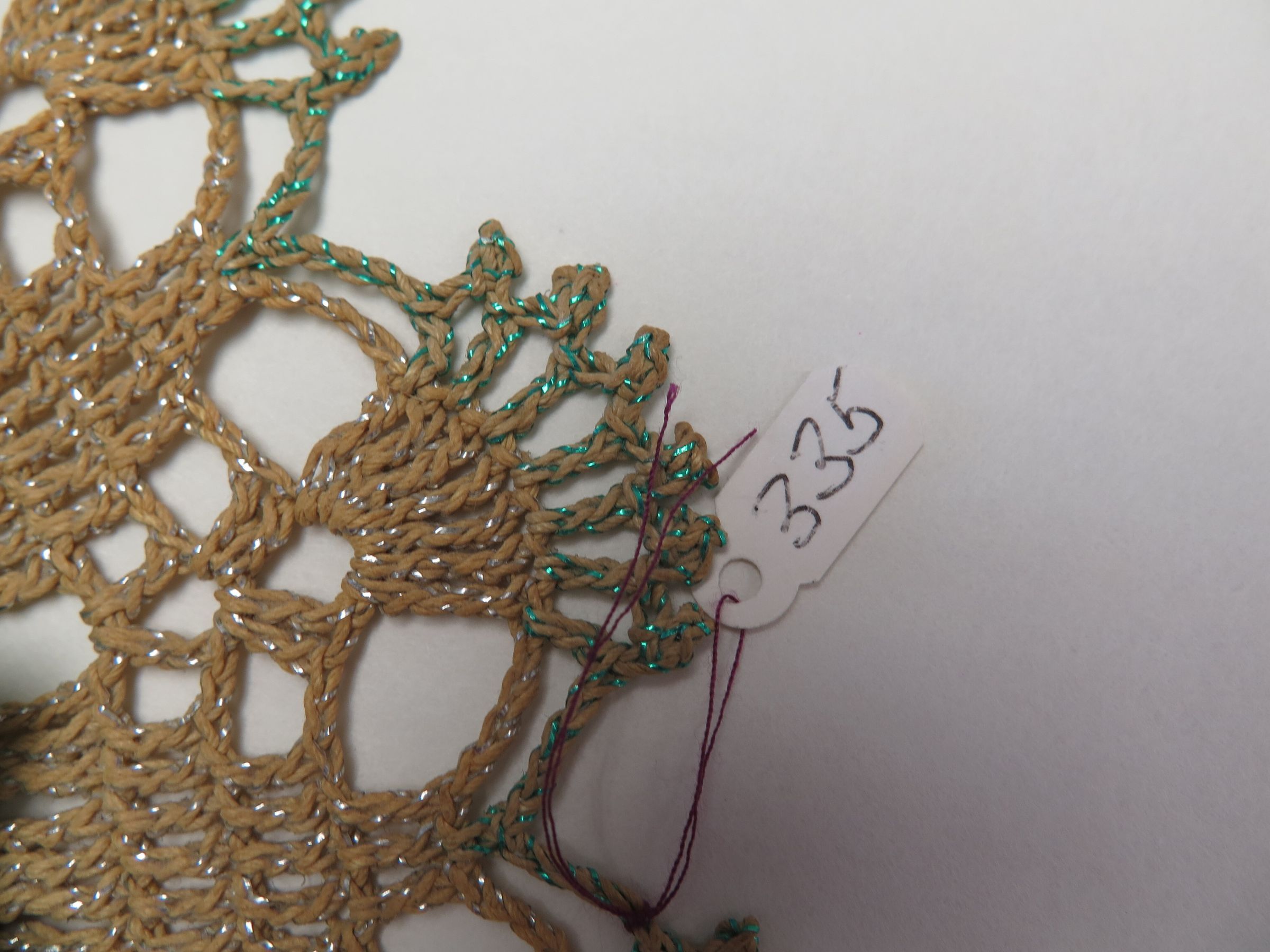 This is a crocheted hat made of green, yellow, and metallic thread. The hat has green and pink ribbon on the top and a green ruffle around the top. The hat measures 2" (h) x 9.5" (diam).