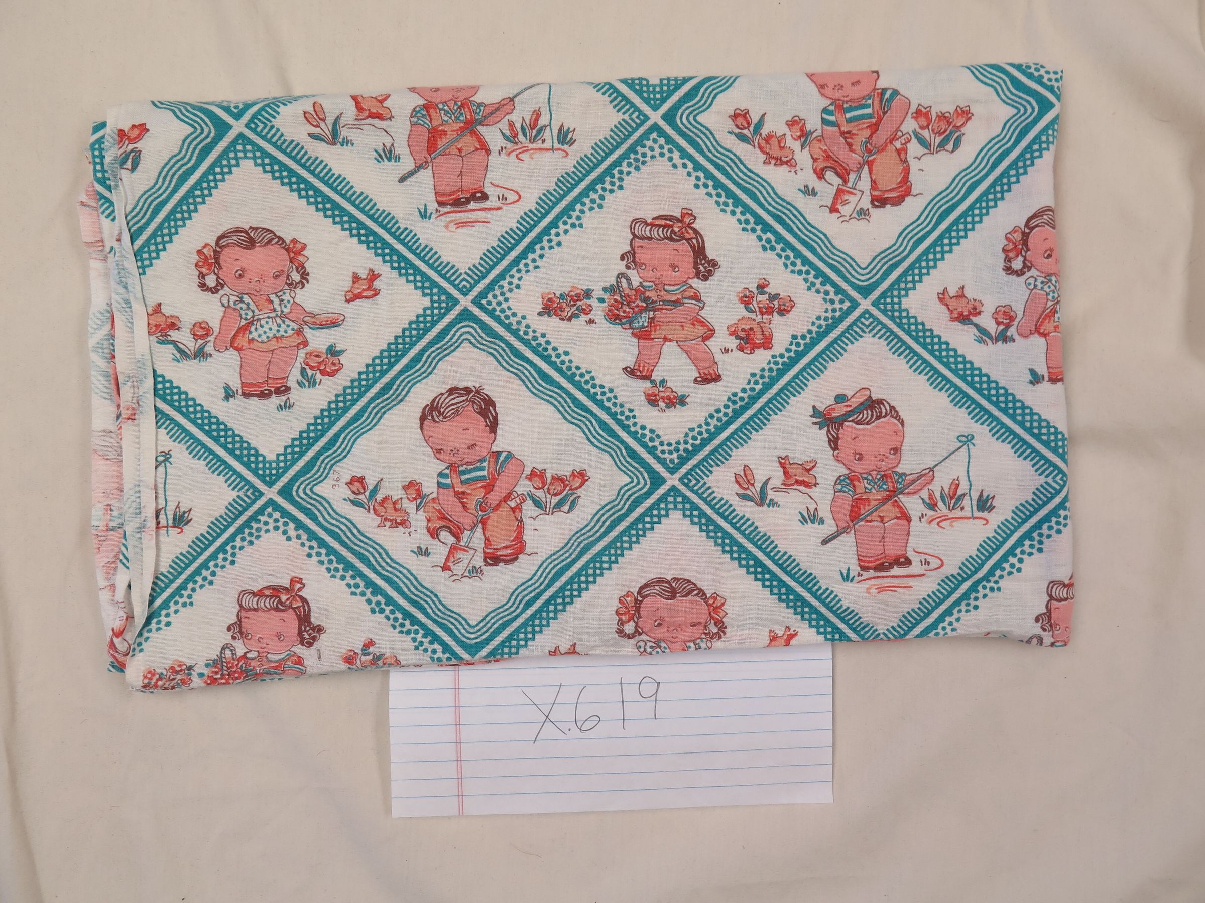 This is a piece of fabric with a Quipe doll print on it. The fabric measures 35" (w) x 42" (l).