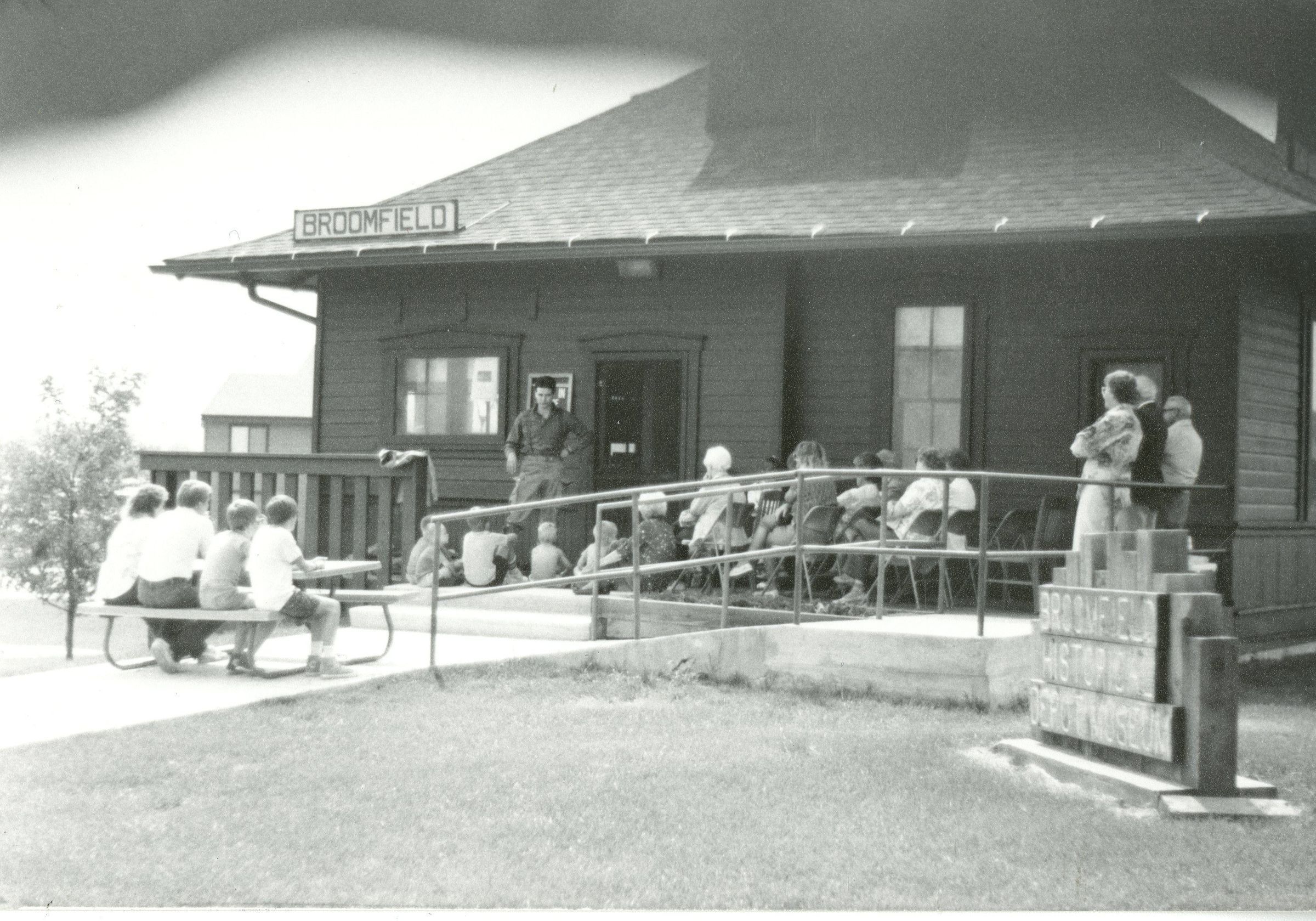Black and white photograph showing a group of adults and children on the porch of the Broomfield Depot. They are paying attention to a guest speaker. The guest speaker is standing to the left of the entrance to the museum. Handwritten on the back is "Program at Depot."