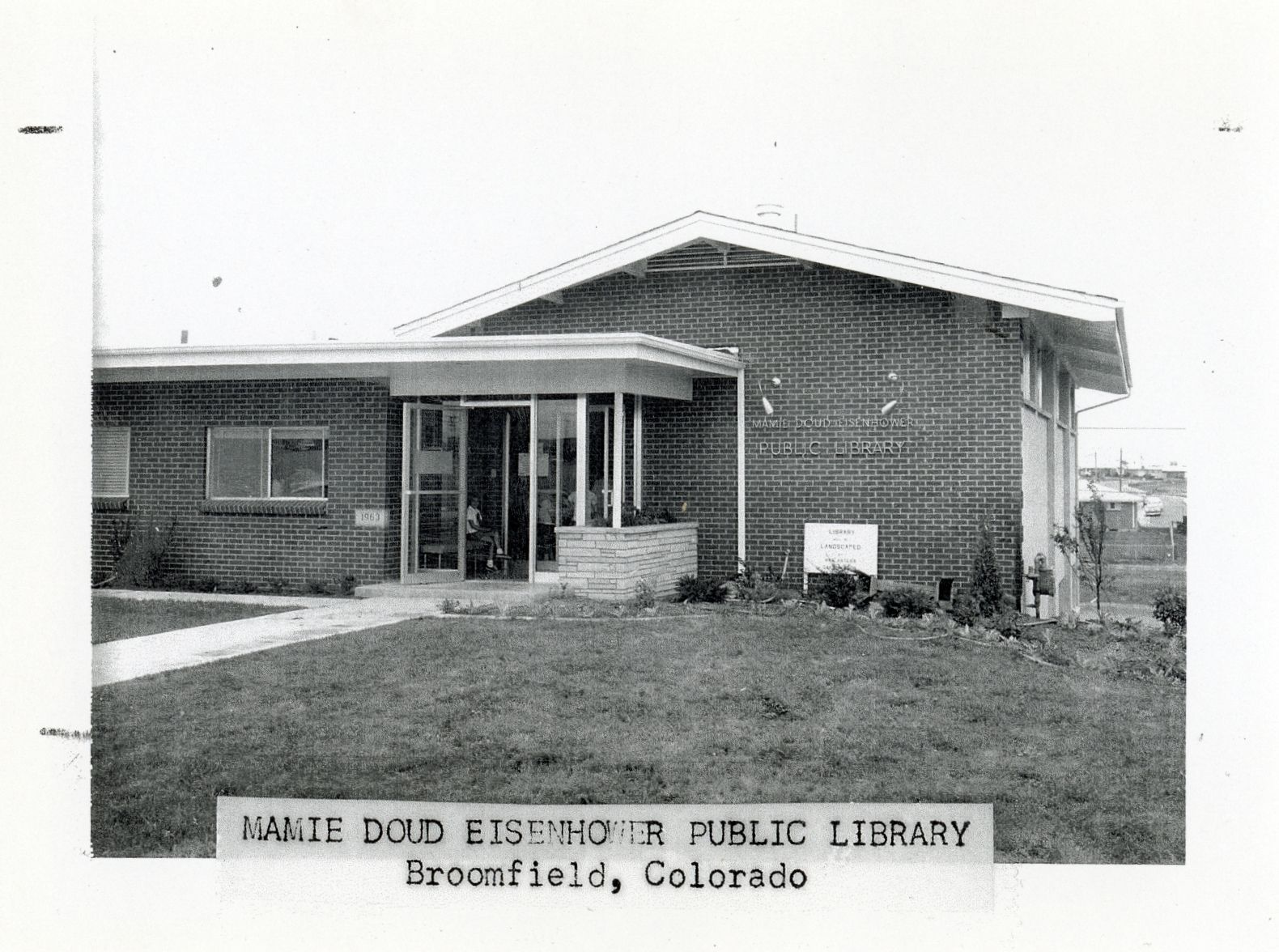 Item is a black-and-white photograph of the original Mamie Doud Eisenhower Public Library in Broomfield. This 3,226 square foot building was located at 12 Garden Center and first moved into on March 15, 1963. President Dwight D. Eisenhower and Mamie Doud were honored guests for its dedication on July 7. This photograph shows the building in use: people can be seen near the doors and sitting on benches. A new library building was constructed in 1995, followed by an even more updated one in 2001. 12 Garden Center now houses the Broomfield Veterans Museum. The photo is laminated and has a white border.