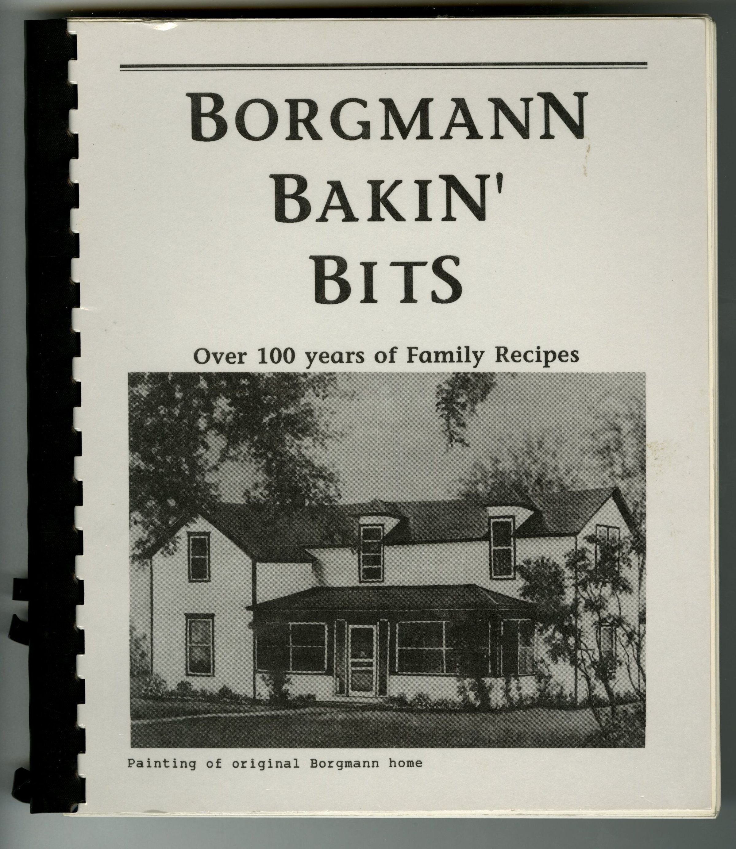 Physical Characteristics: 9" (H) x 8" (W) x .5" (D), 163 pages. Black comb binding. Gray laminated cover. Picture of original Borgmann home on lower half of front cover. Back cover blank.