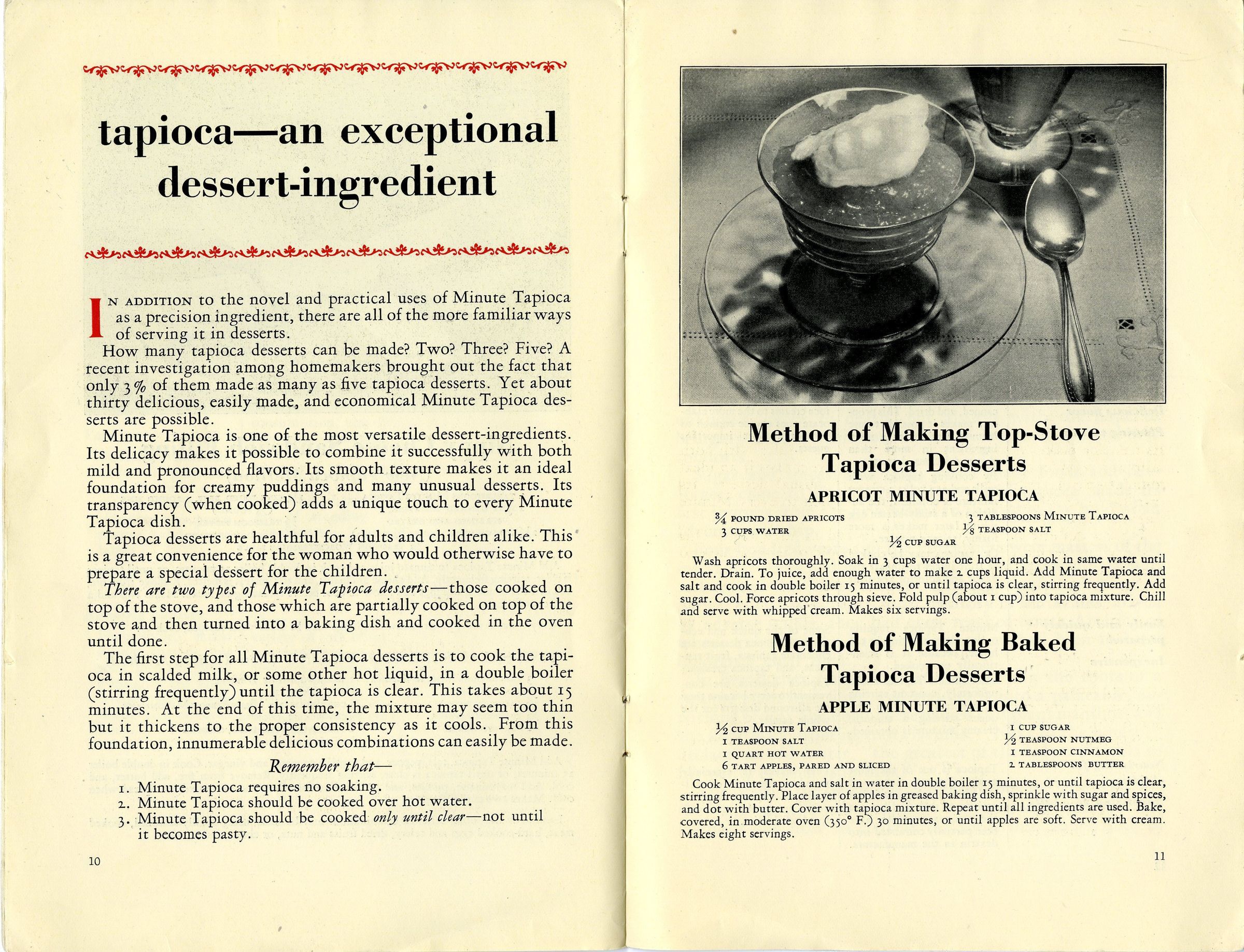 Cookbook with recipes focusing on tapioca. The book includes 15 pages of tapioca recipes, background information, pictures, and advertisement. The book specifically detailed recipes and facts concerning the Minute Tapioca brand of foods, part of Postum Company, Inc.