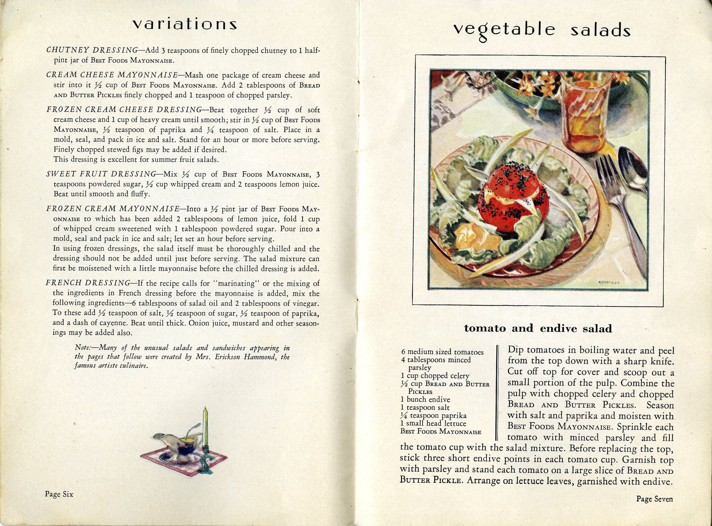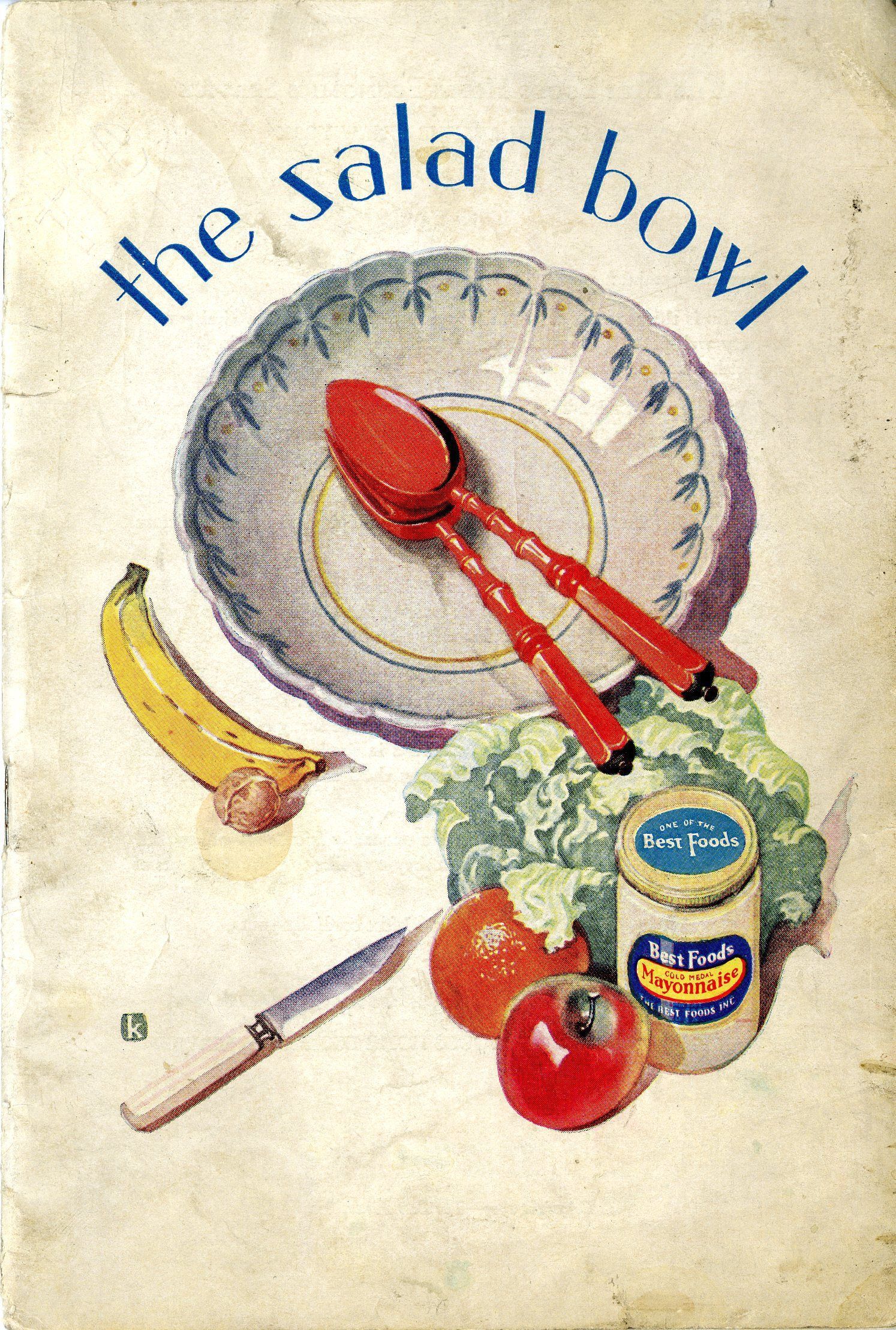 Physical Characteristics: 7.5" (H) x 5" (W), 23 pages. Staple bound, lithograph. The cover has an illustrated color picture of a salad bowl with a pattern around the edges and two red spoon utensils resting in the middle. A knife, different fruits, a head of lettuce, and a jar of Best Foods brand mayonnaise is seen below the bowl. the back cover has an identical illustration.Collection