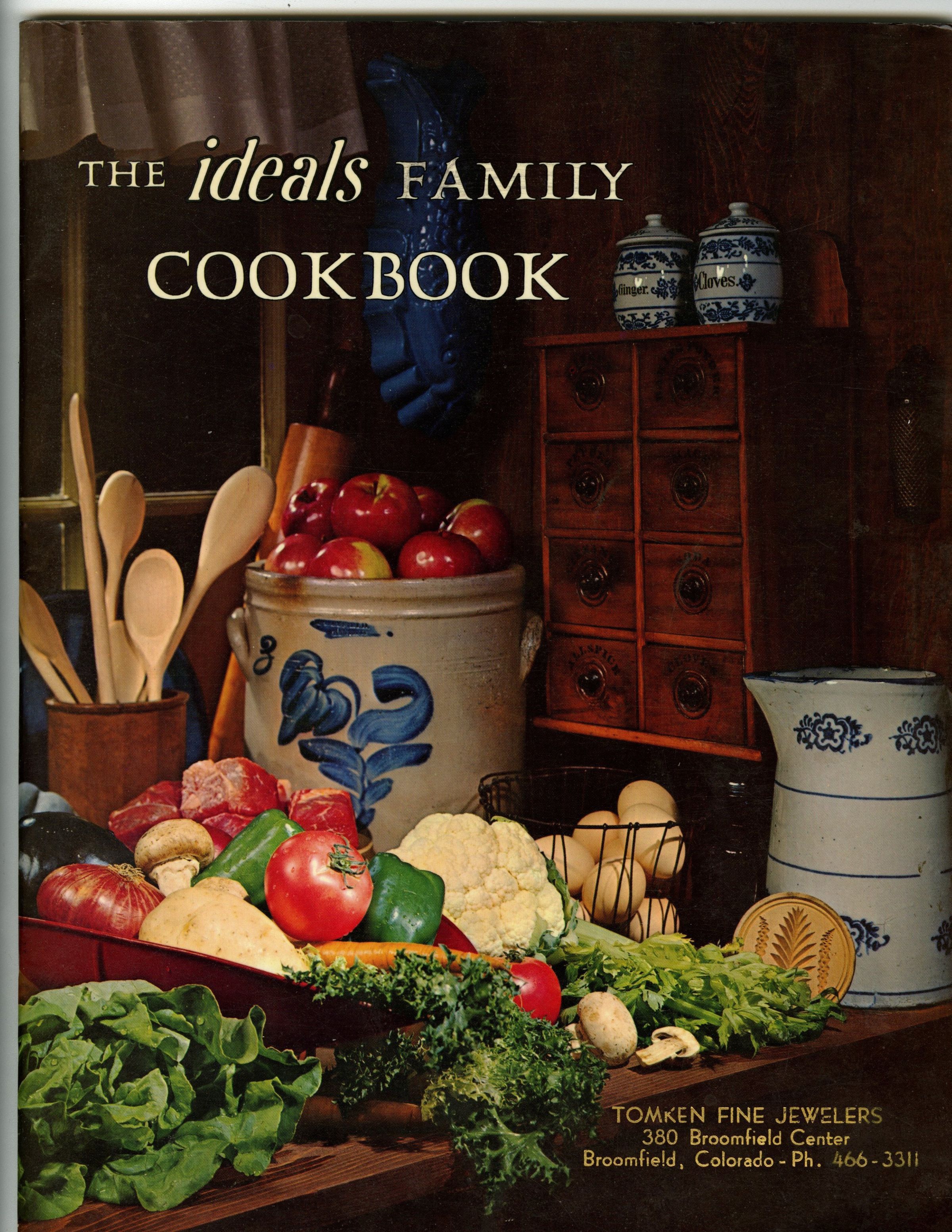 Physical Characteristics: Coated cardstock cover, 64 pages, 11" (H) x 8.5" (W). Full color photograph of a kitchen counter with utensils and food on front cover with title in upper left hand corner. Gold imprint in bottom right corner of front cover reads: Tomken Fine Jewelers/ 380 Broomfield Center/ Broomfield, Colorado - Ph. 466-3311. Back cover is plain blue with Ideals logo on bottom center. Small stains on bottom back cover at edges.Collection