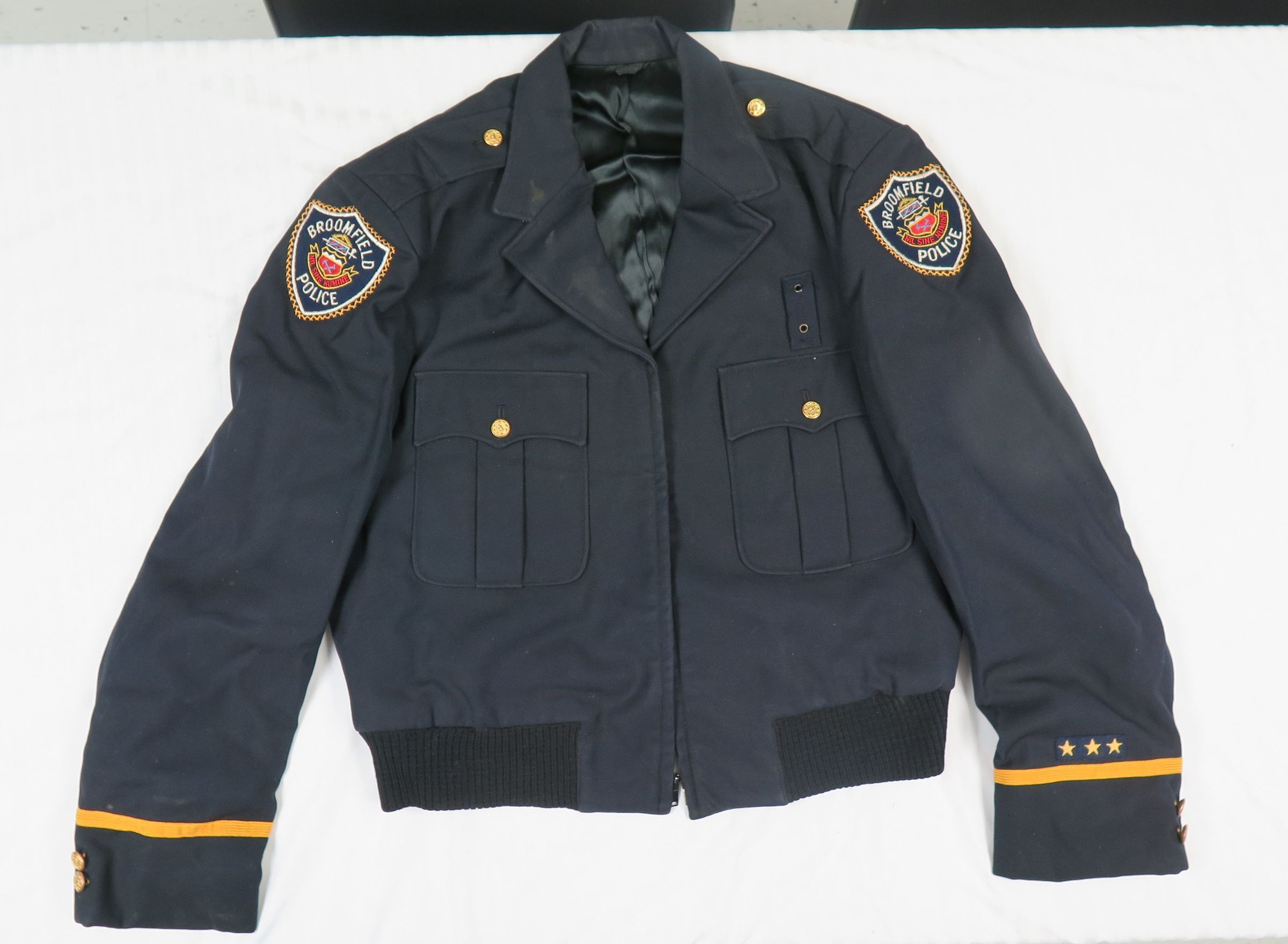 This is a blue winter dress jacket that was part of a Broomfield Police Department uniform. The jacket zips up the front, and has a patch on either shoulder. The jacket measures 18" (w) x 26" (l).