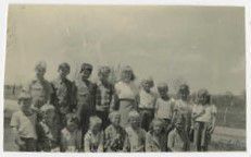 Black and white photograph of a large group of children taken outside. There are a few trees in the background. Handwritten in the lower right-hand corner is "Lester." One of the children is probably Lester K. Brunner.