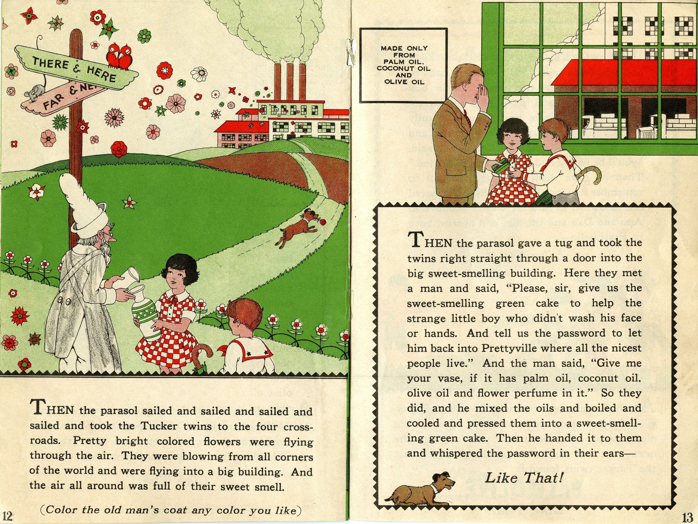 A children's coloring book, titled "The Magic Parasol", 1928. The book is 15 pages long, including a children's story and pages for coloring. The book also serves as an advertisement for Palmolive soap, detailing all the places in the world that the soap's materials were made.