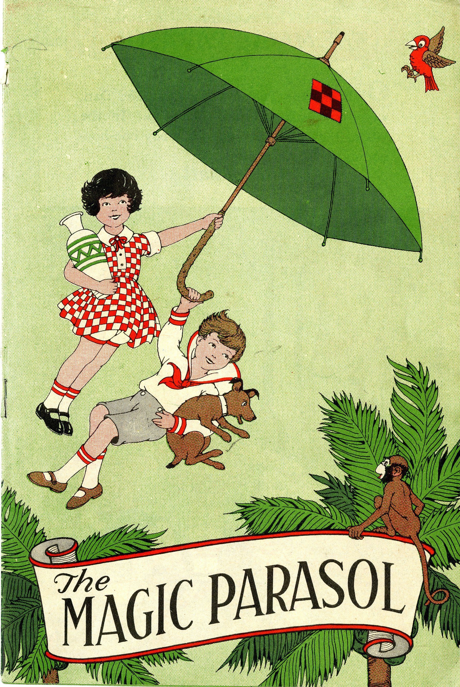 Physical Characteristics: 6" x 9" book, staple bound, lithograph. The cover has an illustrated color picture of a girl in a red checkered dress holding a vase, and a boy in a sailor uniform holding a brown dog, each holding on to a flying green parasol. A monkey in a palm tree is visible in the lower right corner, a red bird in the upper right. The back cover has an advertisement for Palmolive soap, with a boy holding a handkerchief sitting on a green bar of Palmolive soap under a palm tree.Collection
