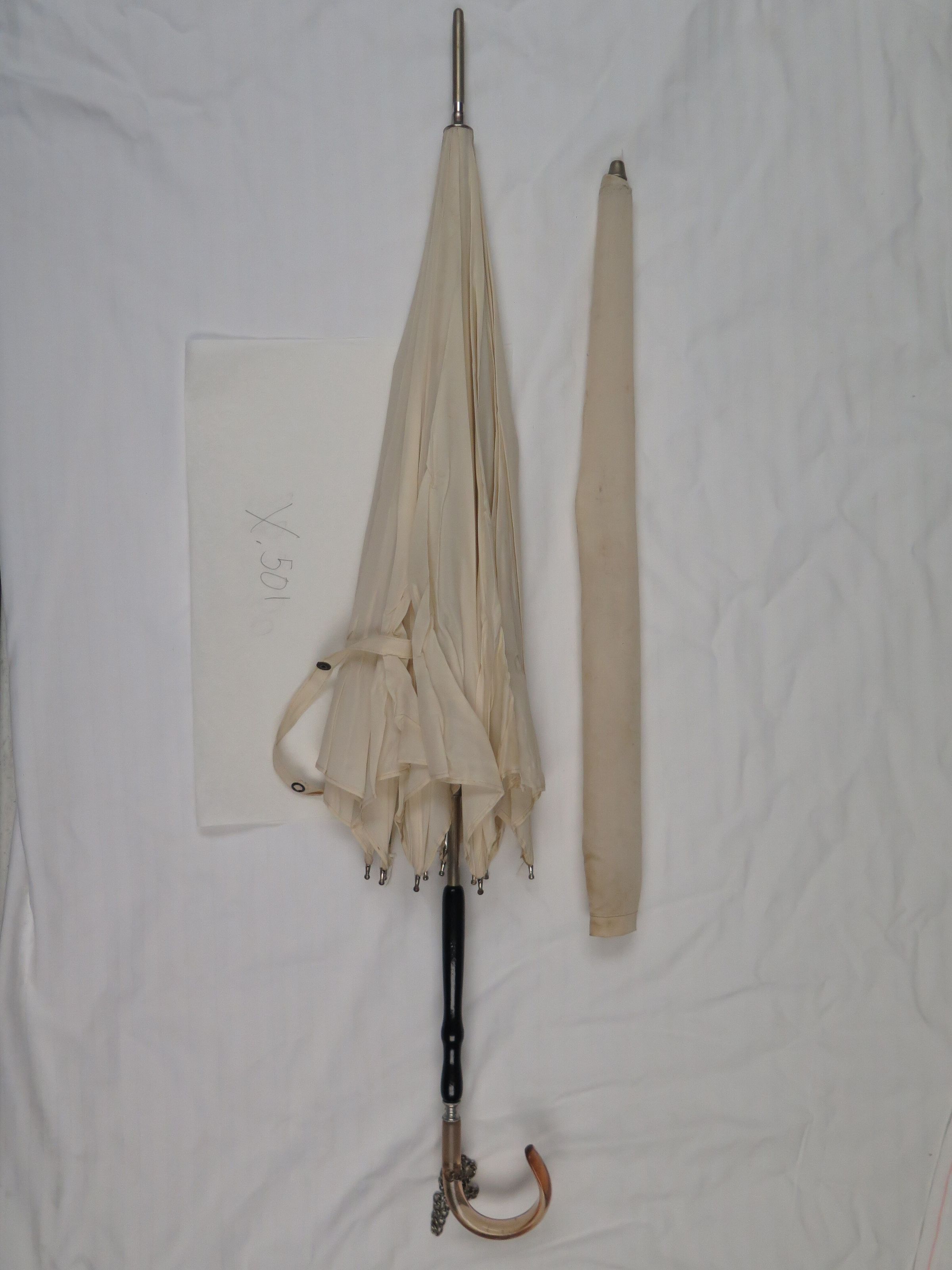This is a metal umbrella with a white handle, white cover, and white case. The umbrella measures 2.5" (w) x 32" (l).