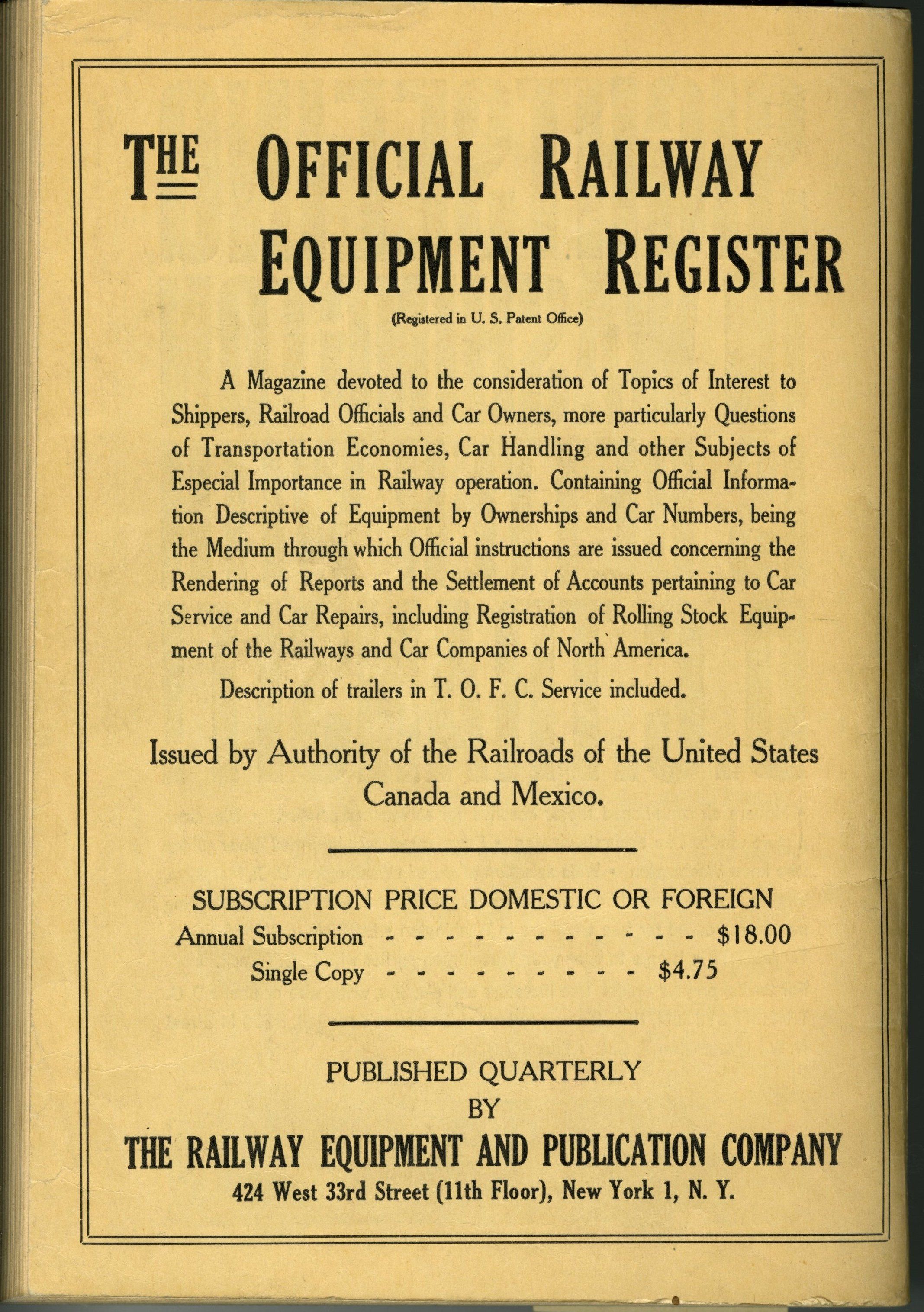 Physical Characteristics: 10" (H) x 7" (W) x 1.5"(D) soft cover book with1175 pages. The cover is black and white with advertising in black text on the borders on the front. The back cover has a black and white advertisement for "The Official Railway Equipment Register."Collection