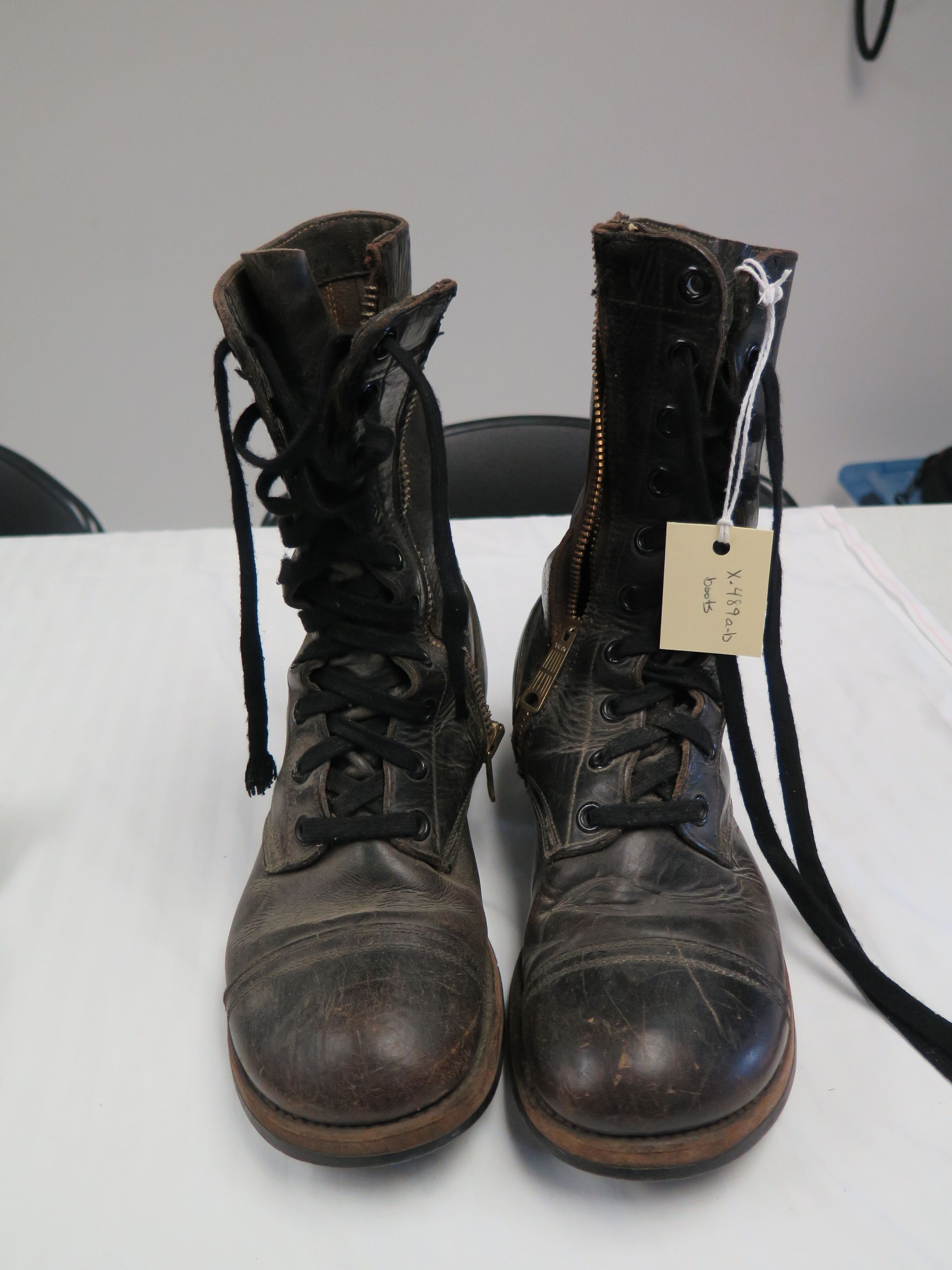 This is a pair of black combat style boots. The boots have laces up the front and zippers on the inside of the foot. The boot each measure 9.5" (h) x 4" (w) x 11.5" (l).