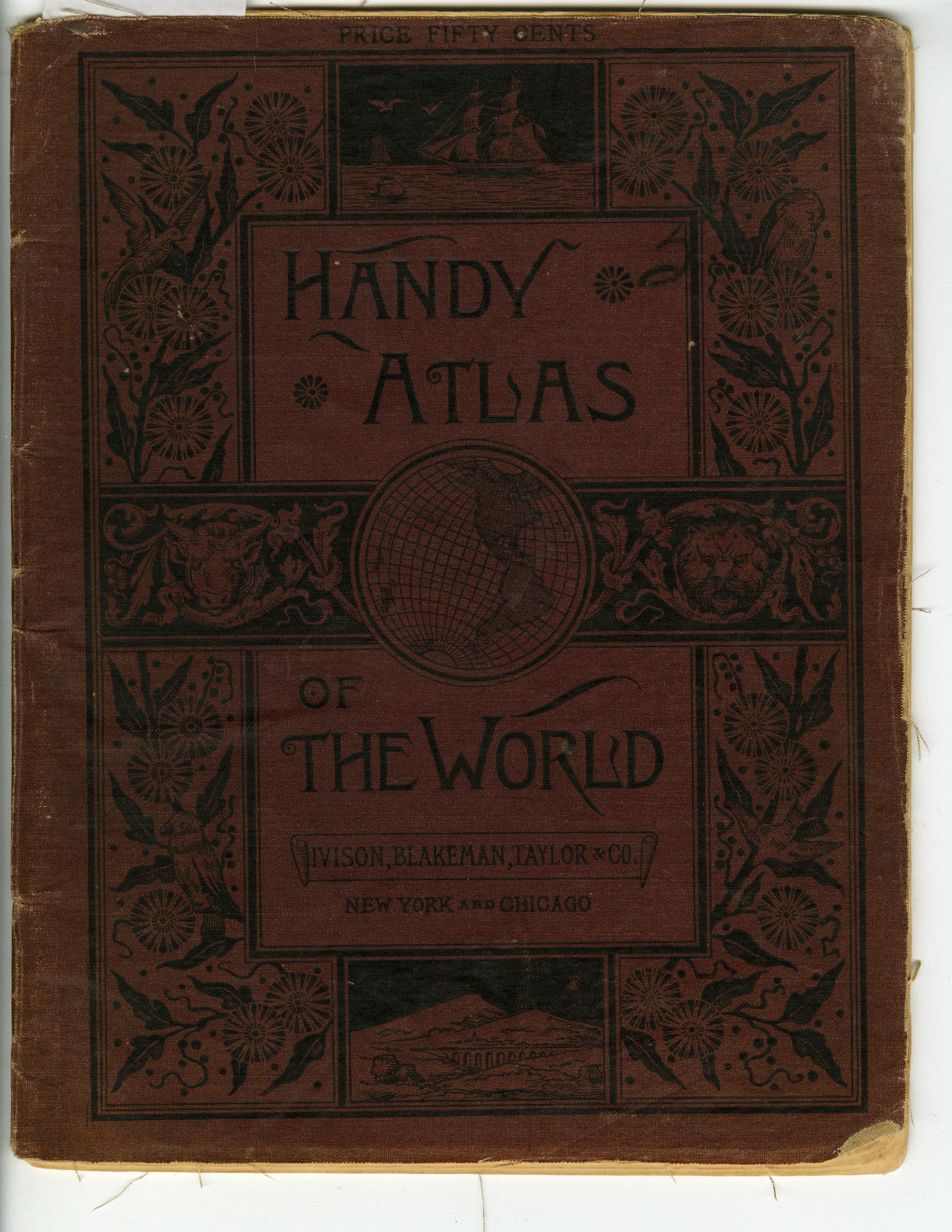 Book, "Handy Atlas of the World". On front at top reads "Price fifty cents".