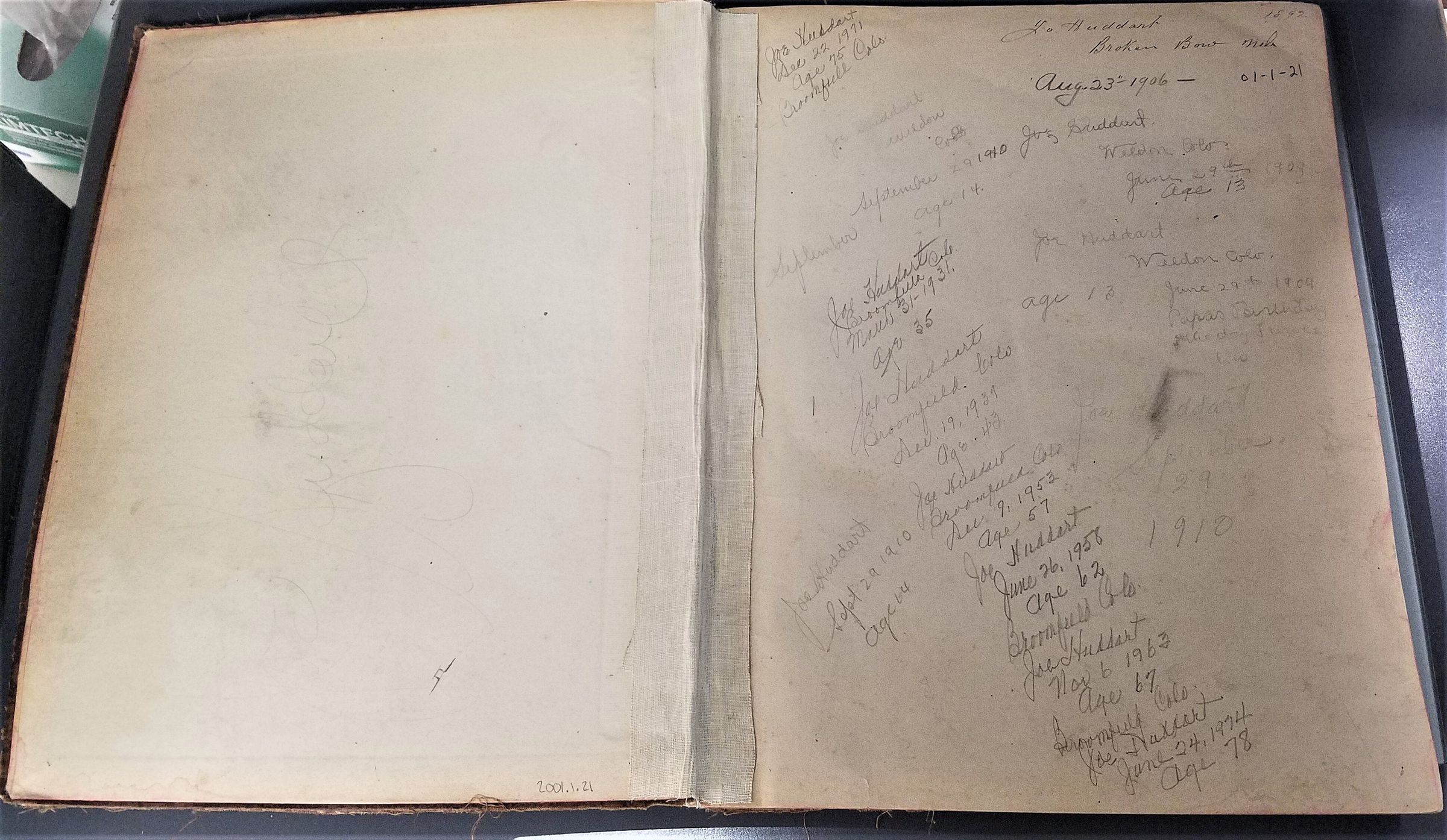 The 196 page atlas has the age and location of Joe Huddart in many different years written on the first and last page. These dates range from 1892, when Joe was in Nebraska to 1974 when Joe was 78 years old and in Broomfield.Collection