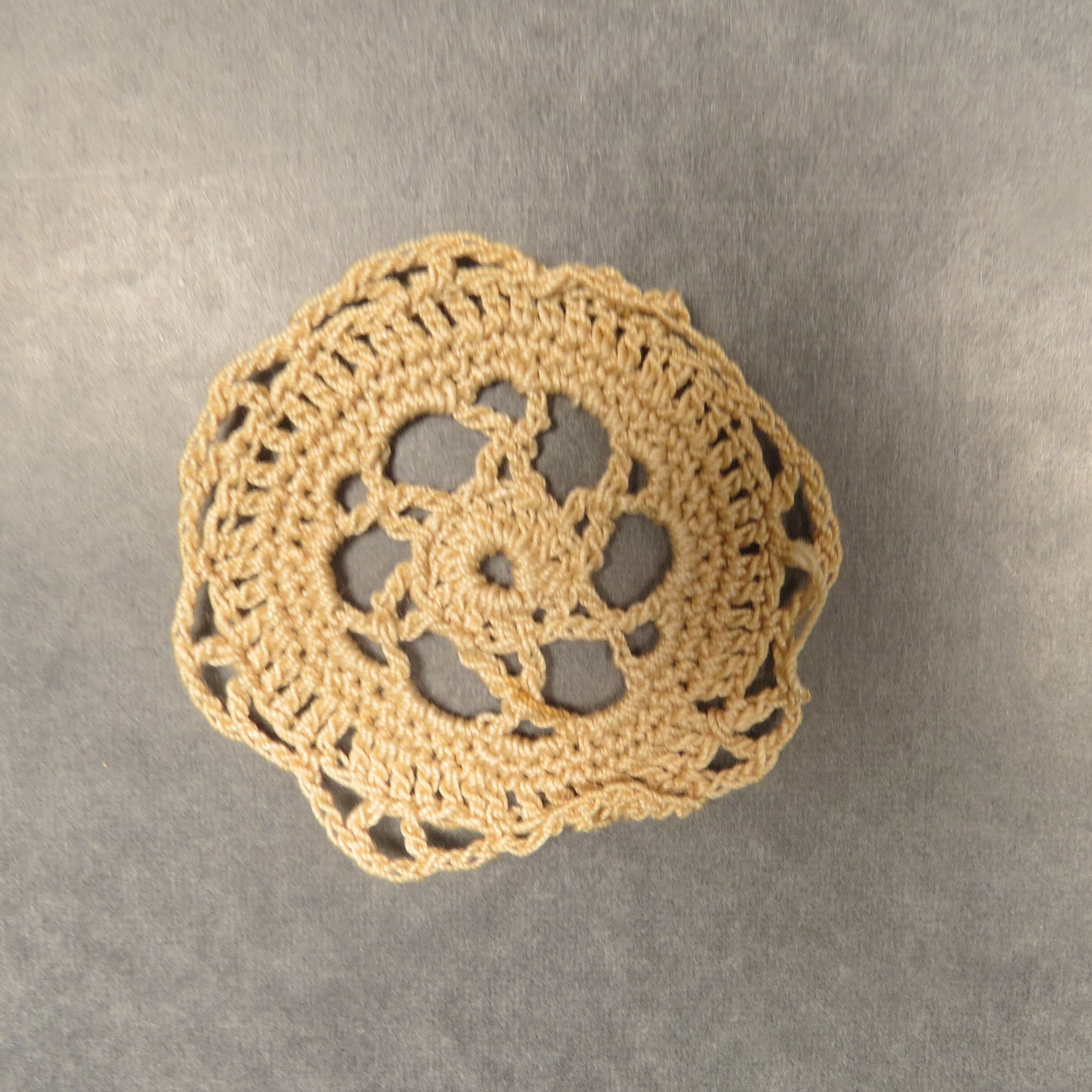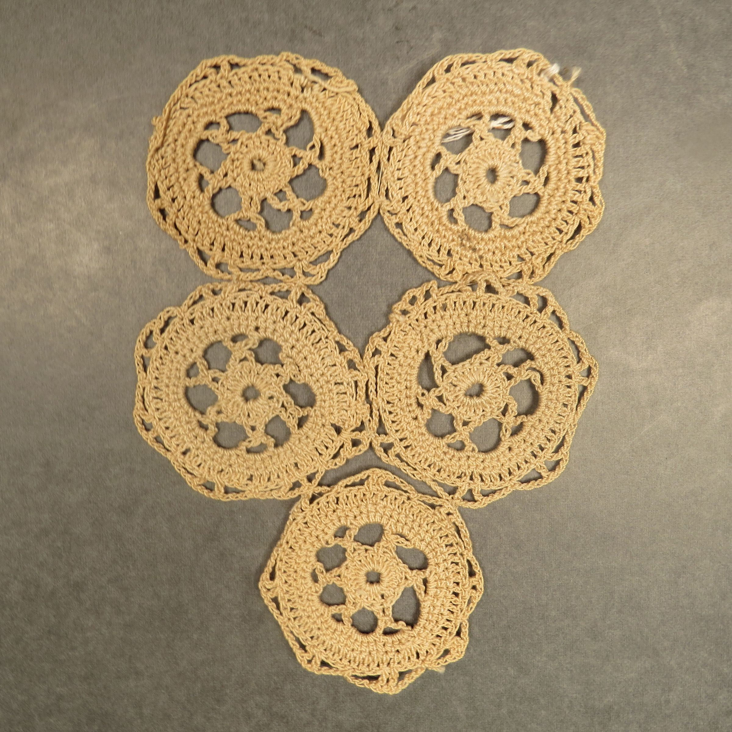White/off white doily made up of 5 crocheted circles. It is believed that one circle has fallen off. The doily has scalloped edges. Doily measures 4" (w) x 8" (l).