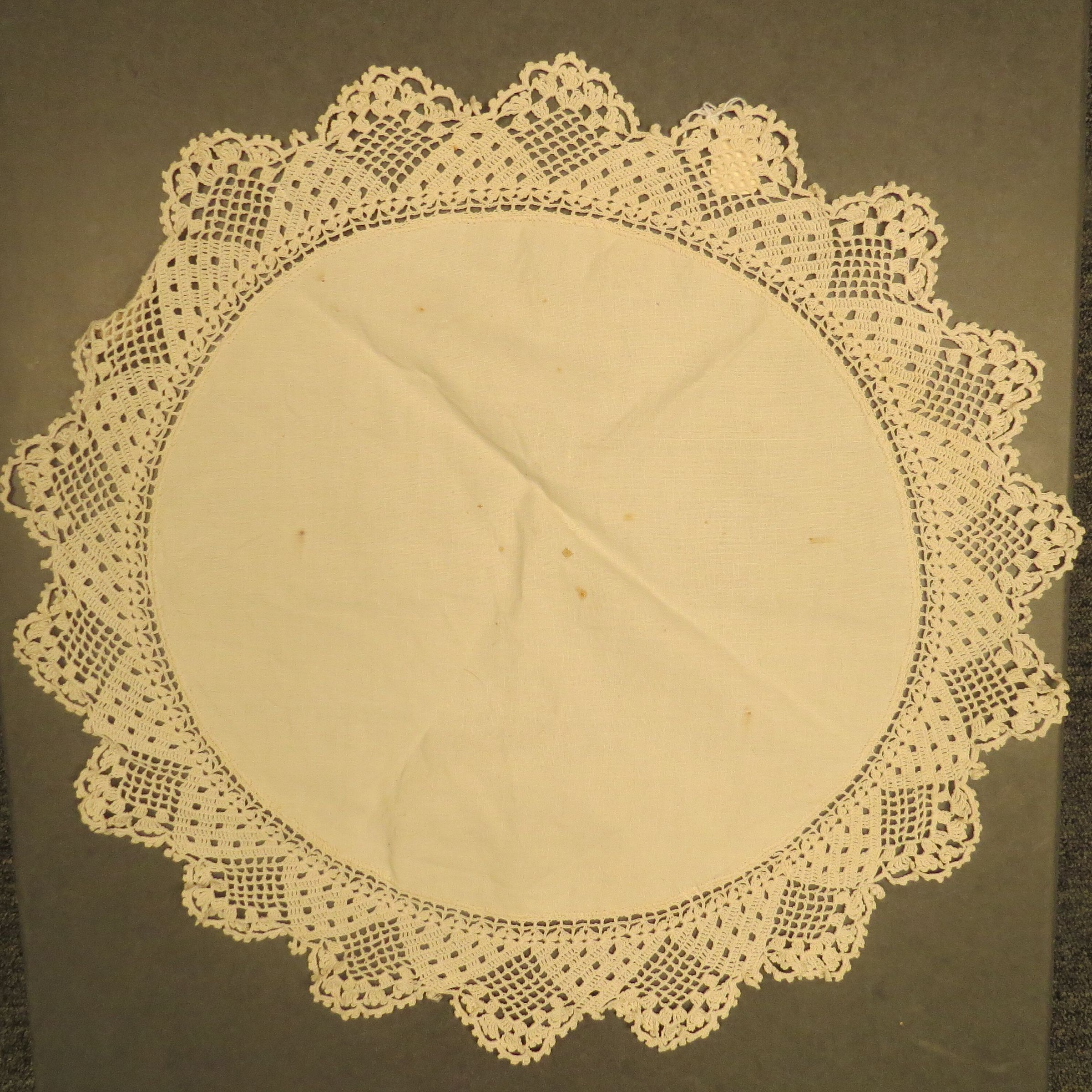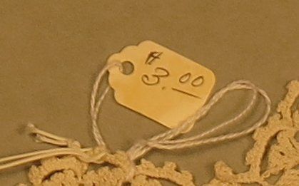 White round doily with crocheted scalloped edges. Tag says it was $3.00. Doily measures 15" (diam). Note: This was recommended for disposal by Megan Huelman in October 2013 (TTempleman 06/30/2017).