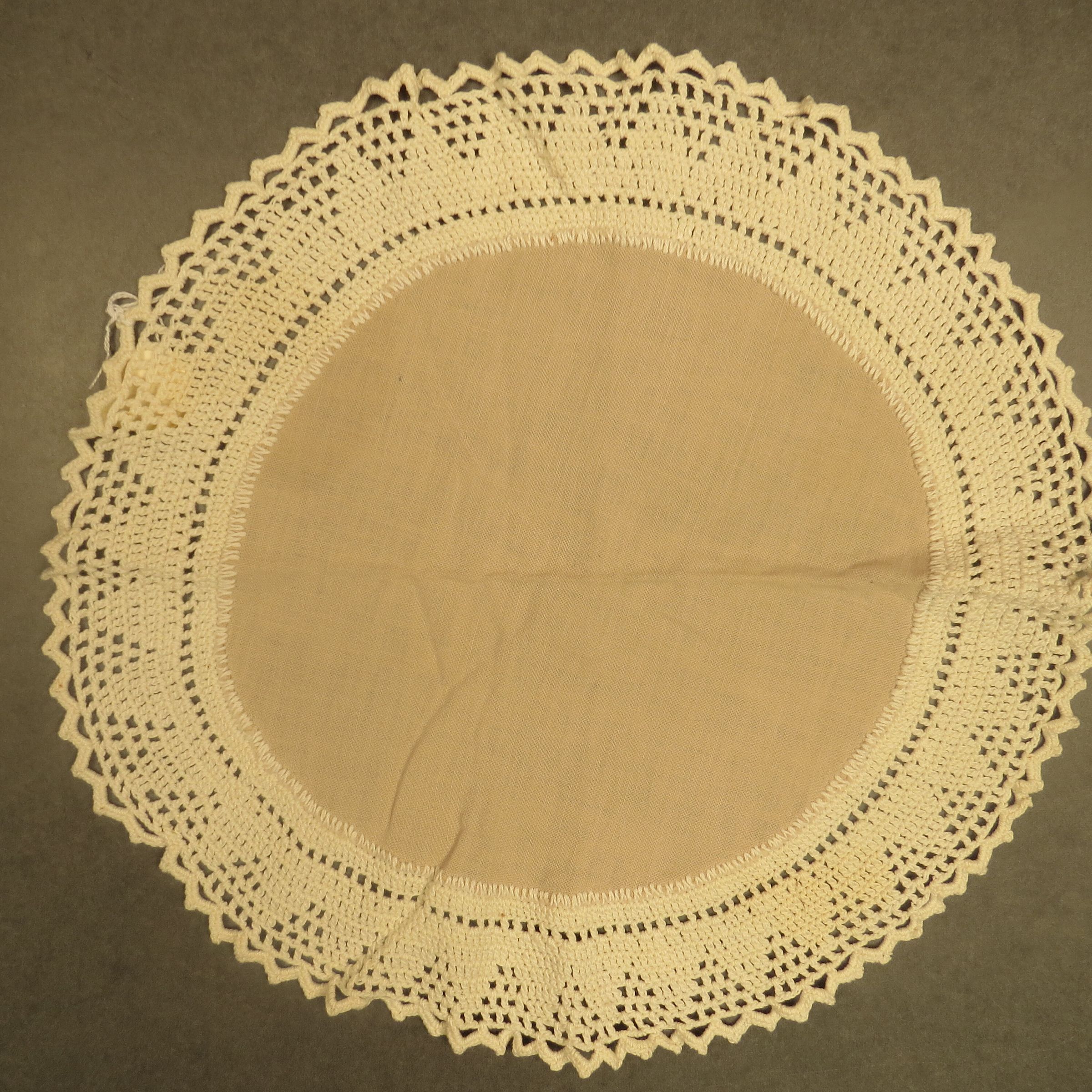 White round doily with crocheted scalloped edges. Doily measures 13" (diam). Note: This was recommended for disposal by Megan Huelman in October 2013 (TTempleman 06/30/2017).
