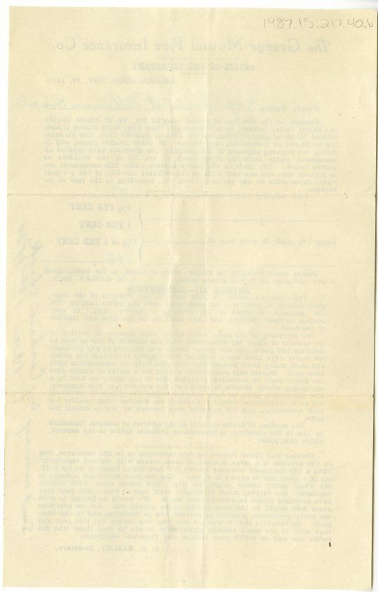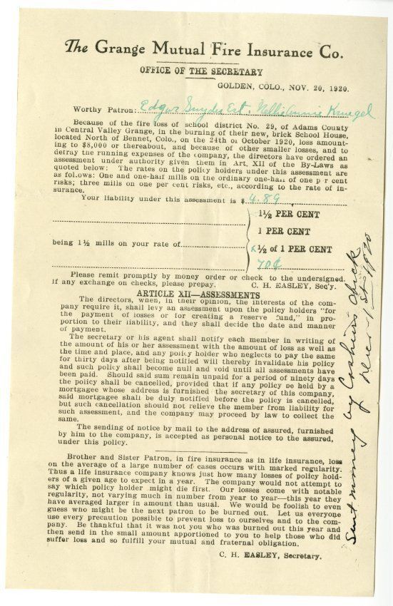 Return address: "If not delivered in ten days return to C. H. Easley, Sec'y. The Grange Mutual Fire Insurace Co. Golden, Colorado."