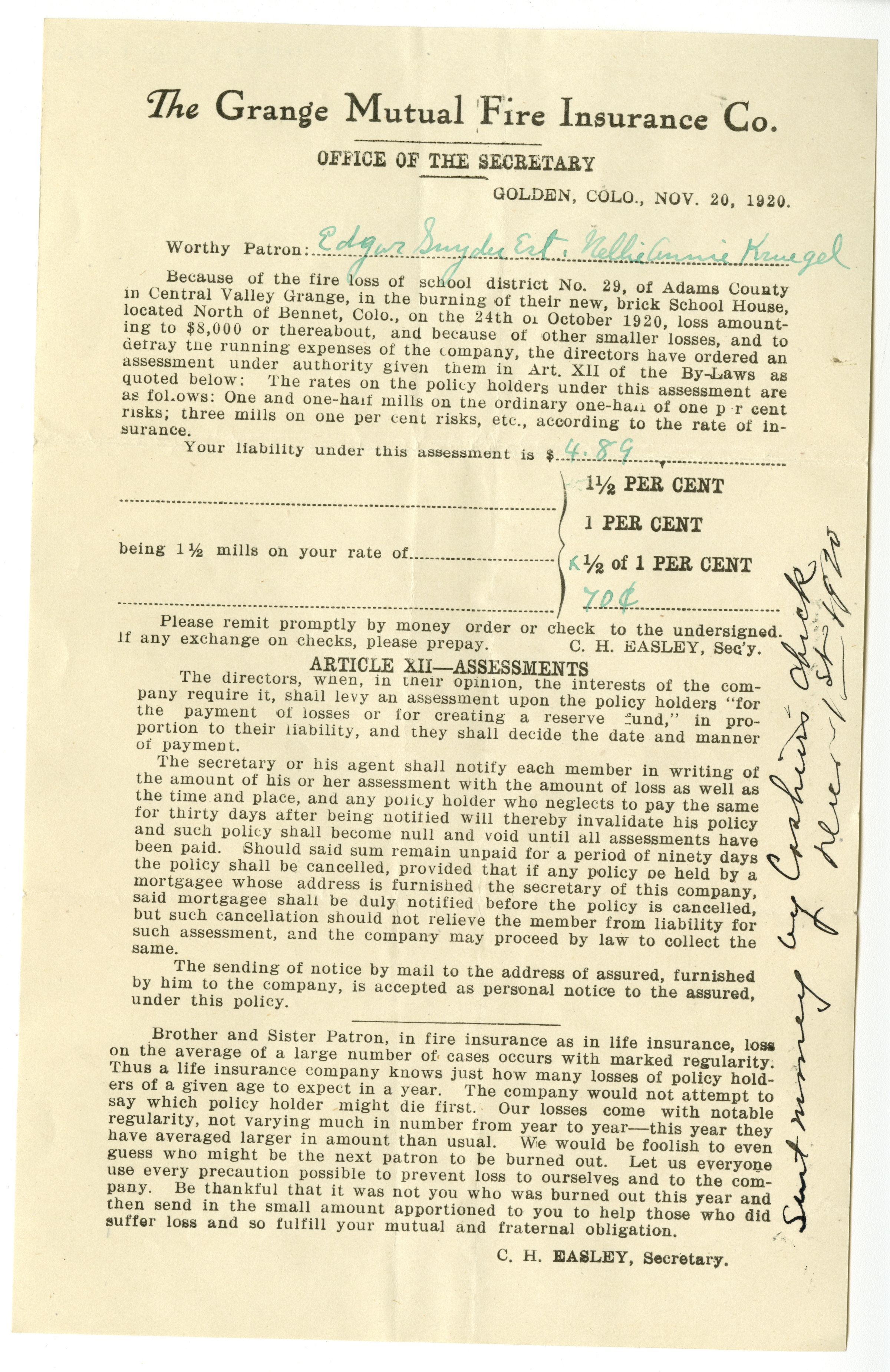 Correspondence from The Grange Mutual Fire Insurance Co. to Nellie Annie Kruegel re: a fire insurance assessment and liability.