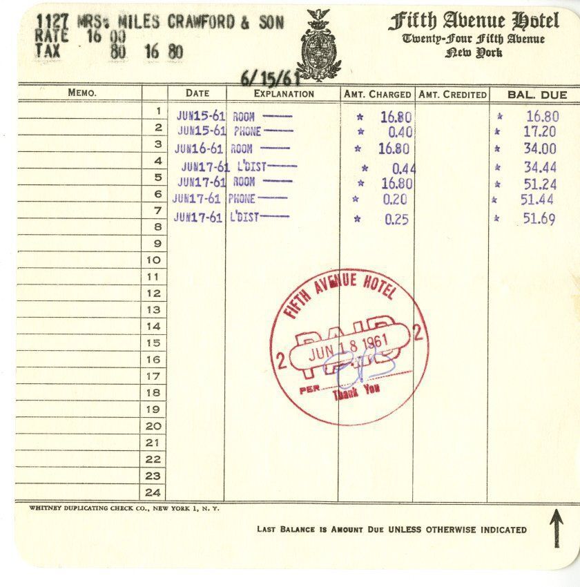 A hotel room bill from the Fifth Avenue Hotel in New York for Mrs. Miles Crawford & Son. Details the costs accrued from June 15-18 including Room cost at $16, Phone usage, and L'Dist. Total spent: $51.69.