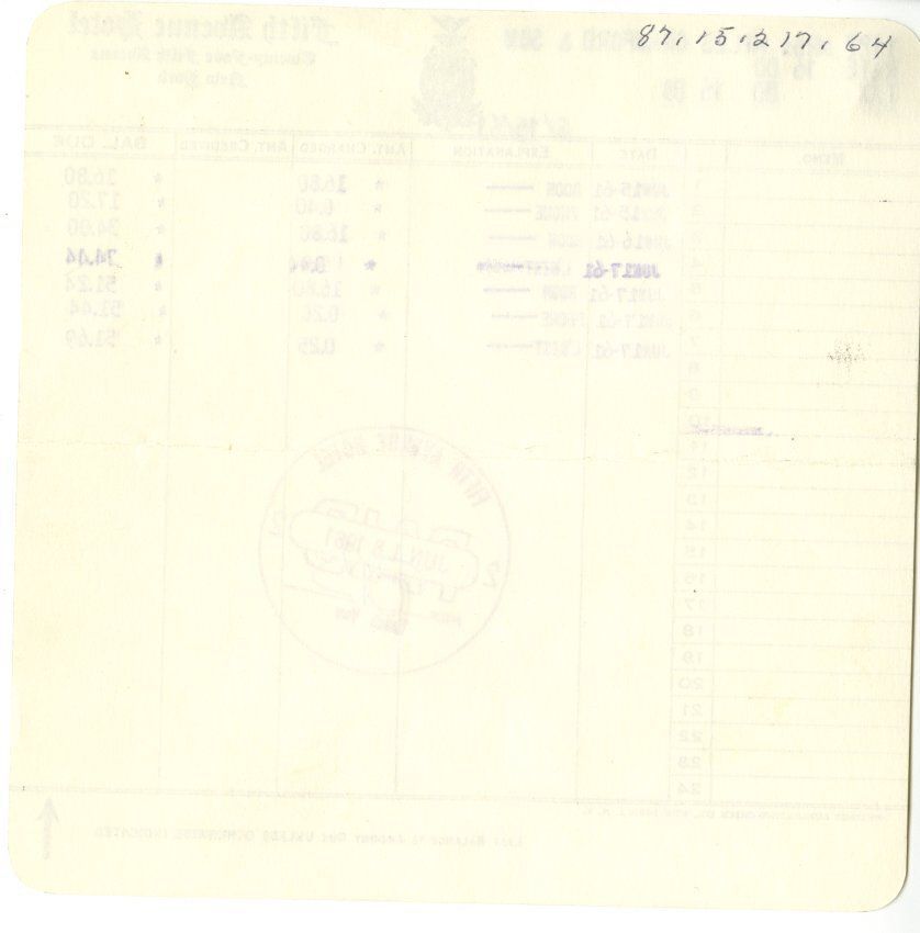 Item stamped and signed by the Fifth Avenue Hotel. Two dates: Date of arrival 6/15/61, Date of stamp: Jun 18 1961.Collection