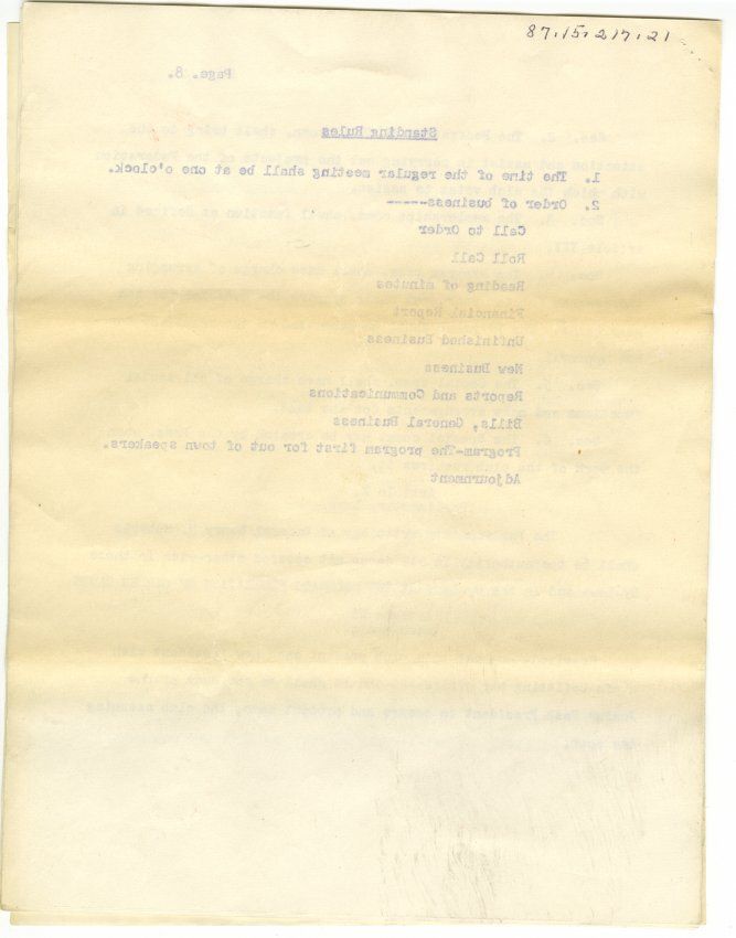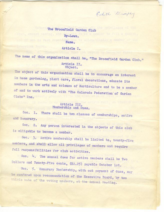 8 single-sided pages, typed, detailing membership, rules, officer roles, processes and purposes of the Broomfield Garden Club.