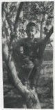 Black and white photograph of a boy sitting in a small tree. There is a truck in the background. The boy is Lester K Brunner. Photograph likely taken between 1944 and 1947