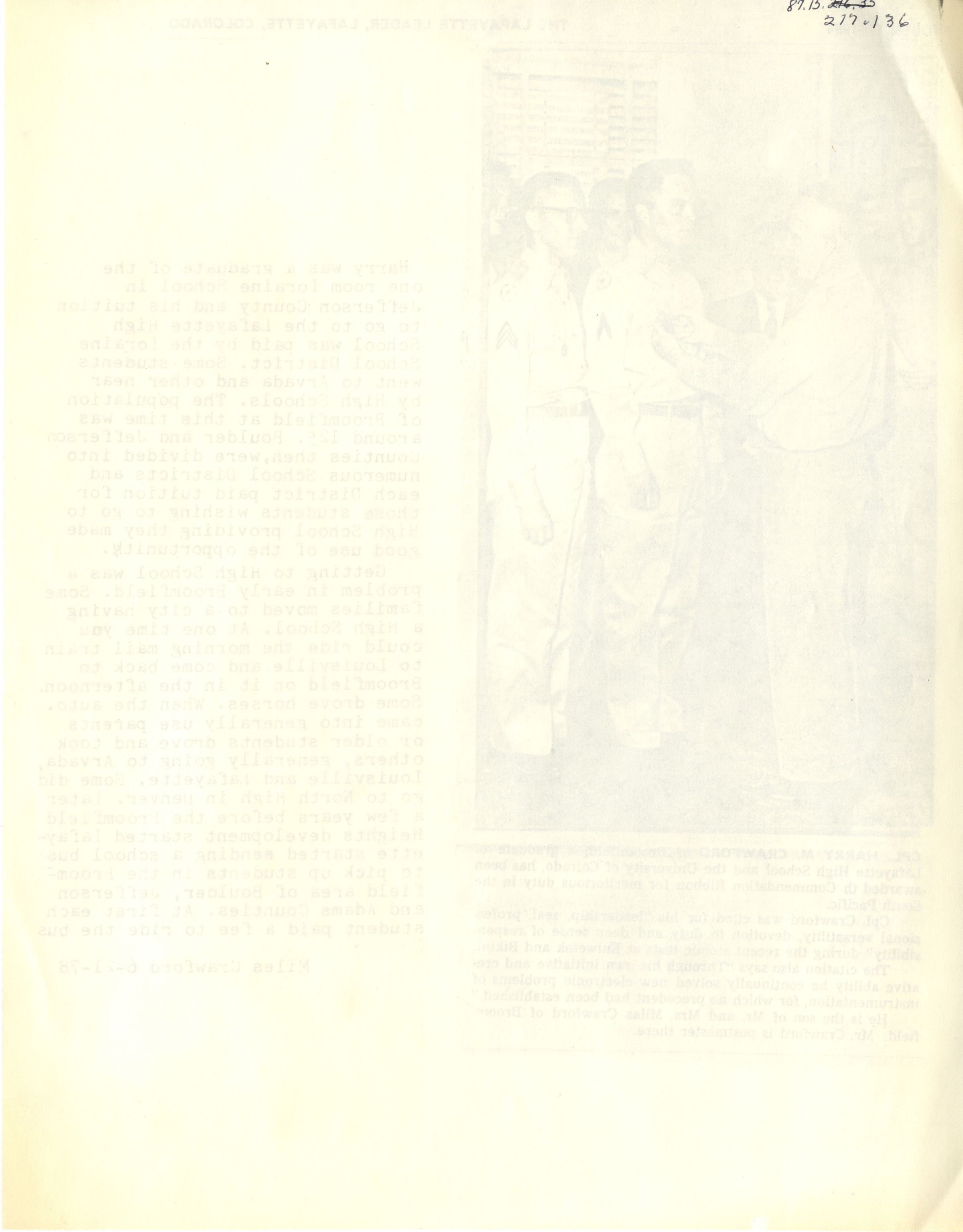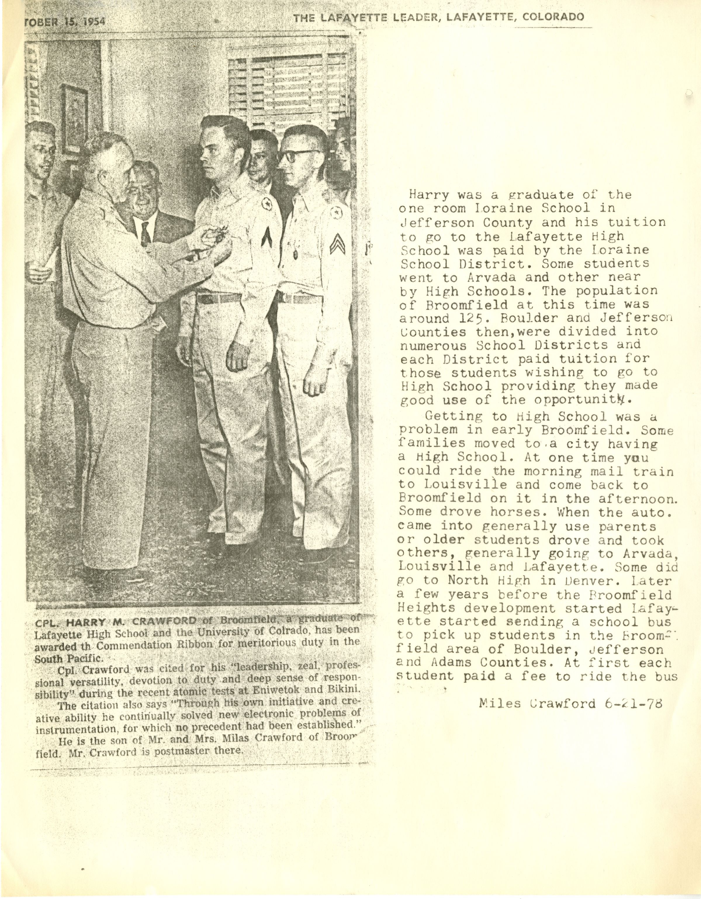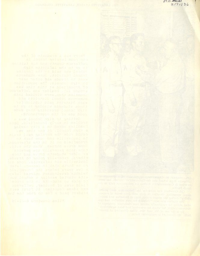Typed Paragraphs: Miles Crawford writes about the context of Harry's education. Lorraine School, to Lafayette High School. Crawford explains the challenges of Broomfield students getting to and from a high school at the time.Collection