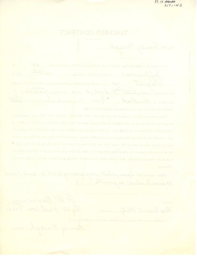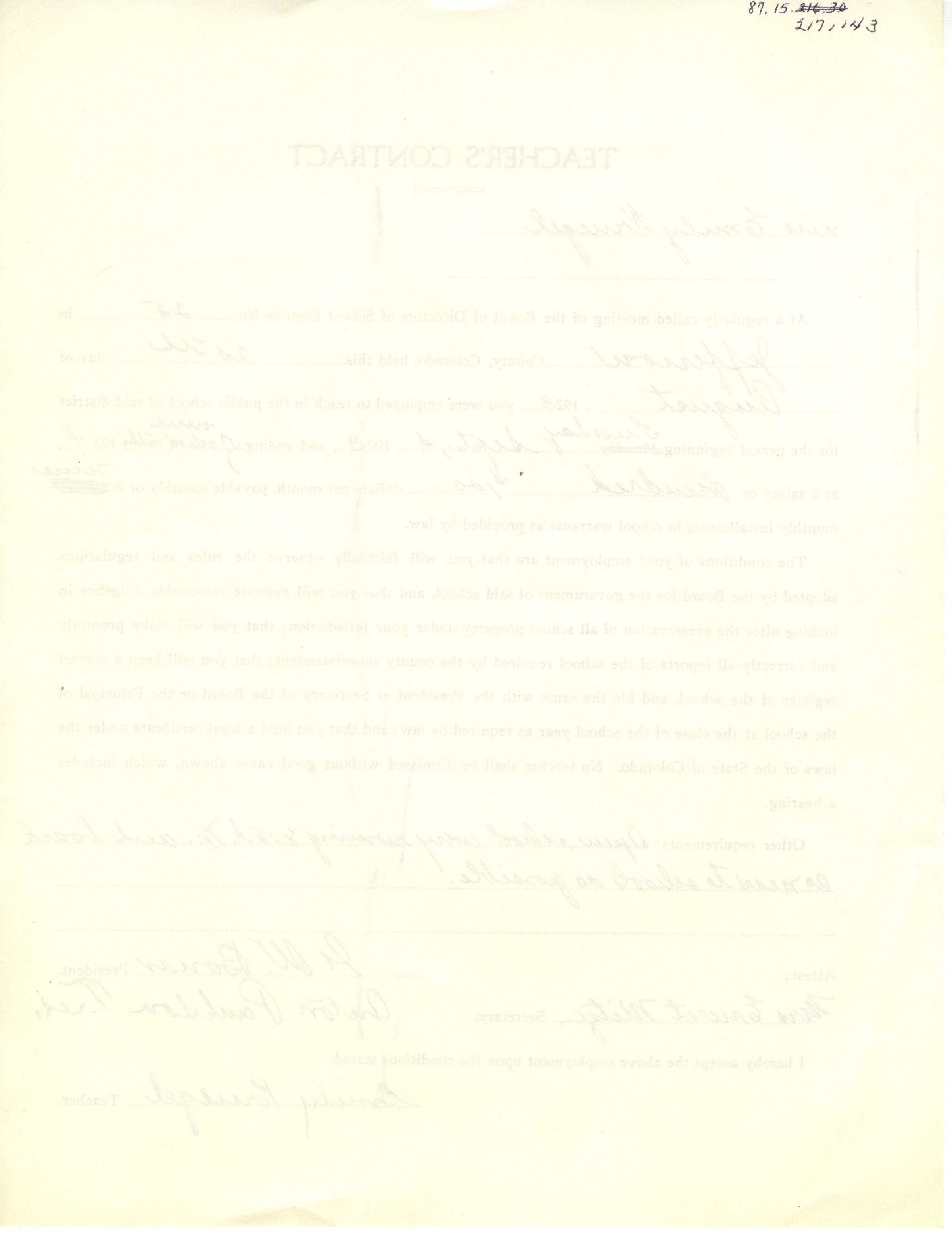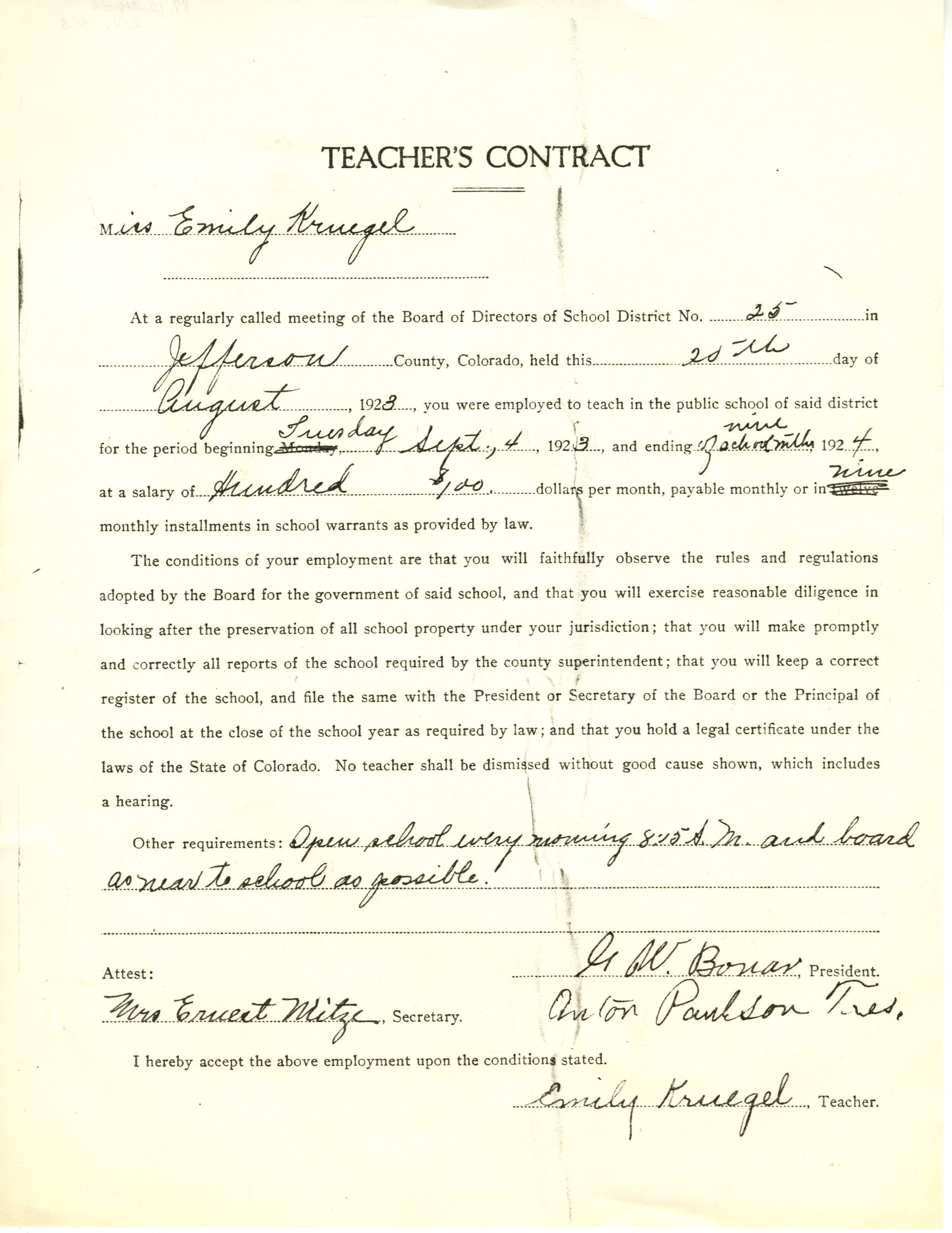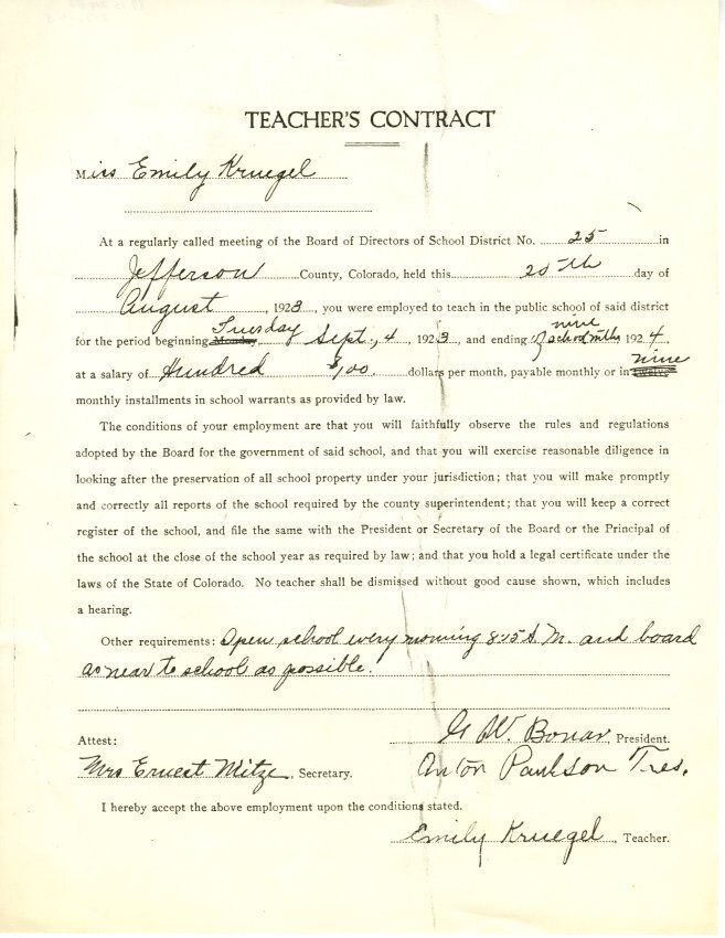 Teaching contract of Emily Crawford (née Kruegel), in 1923. She was paid $100 a month, and was expected to "open school every morning 8:10 A.M. and board as near to school as possible."