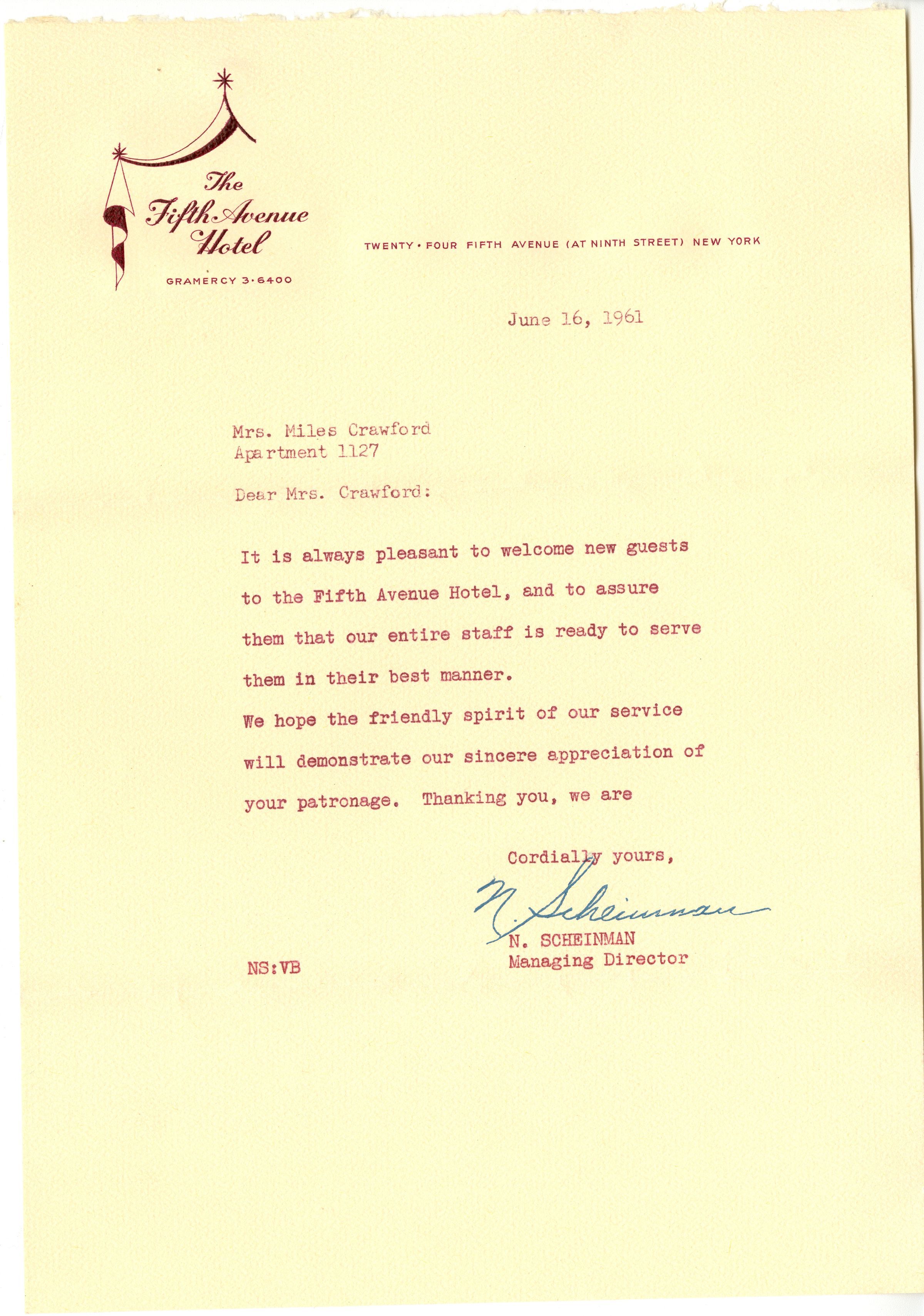 The letter has another stamp in the upper left corner along with the hotel address across the top. It is dated June 16, 1961 and addressed to Mrs. Miles Crawford. It is welcoming her and assuring that staff will serve in their best manner. Signed "M. Scheinman, Managing Director."Collection