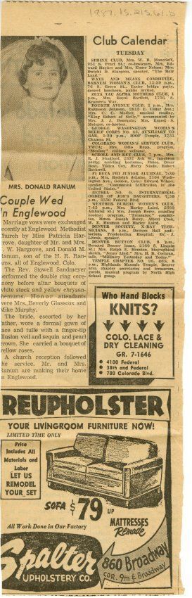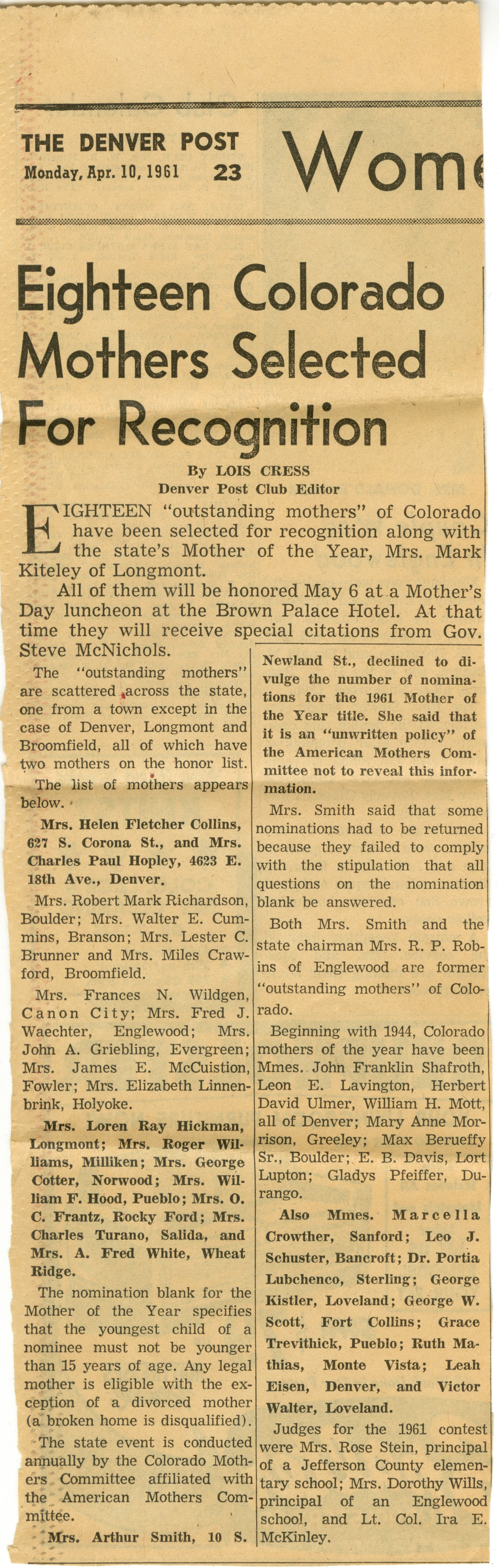 b: Newspaper Clipping. "Eighteen Colorado Mothers Selected for Recognition by Lois Cress.Collection