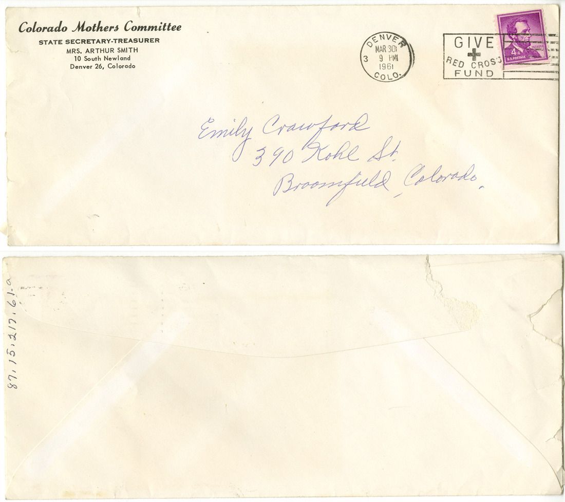 Return Address: "Colorado Mother's Committee. State Secretary-Treasurer. Mrs. Arthur Smith 10 South Newland, Denver 26, Colorado."
