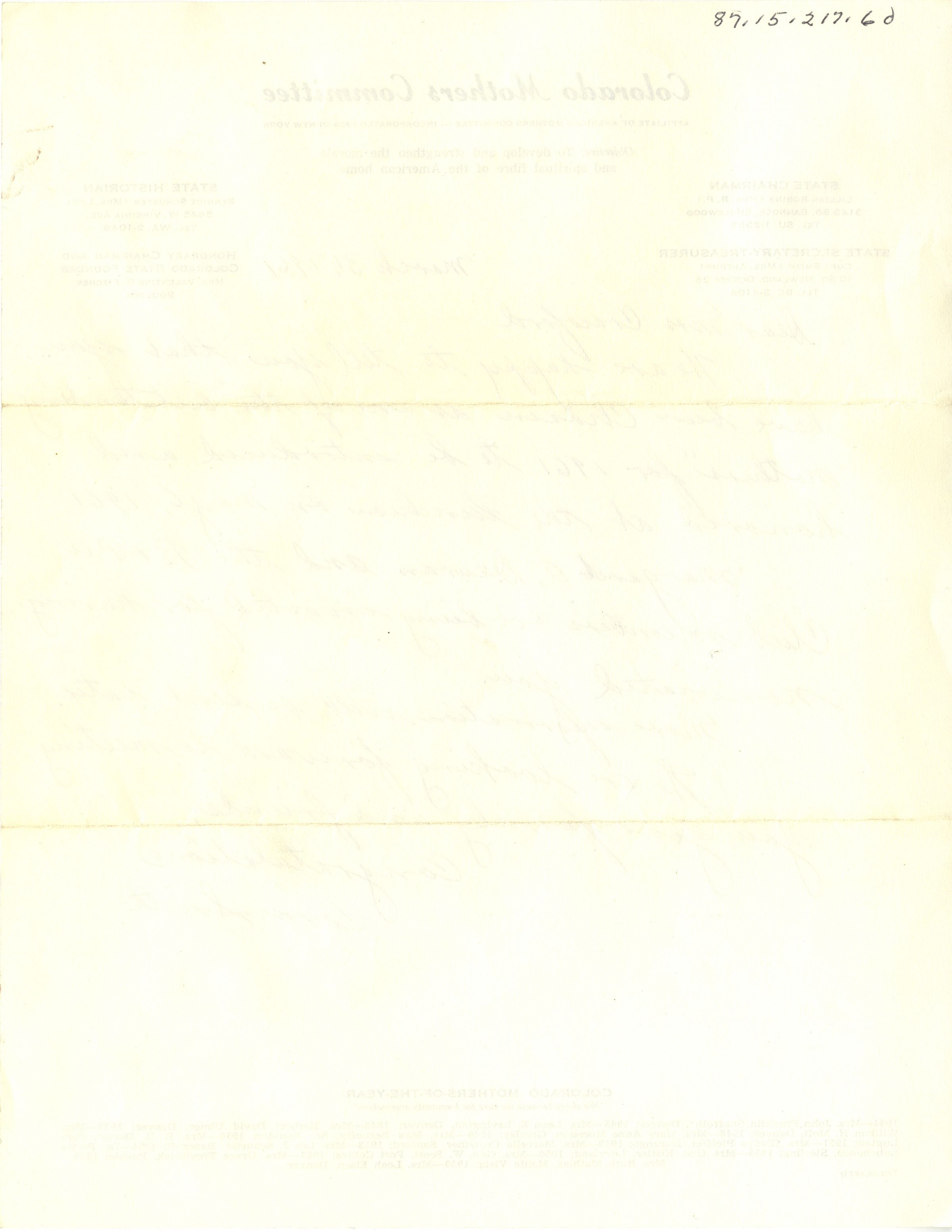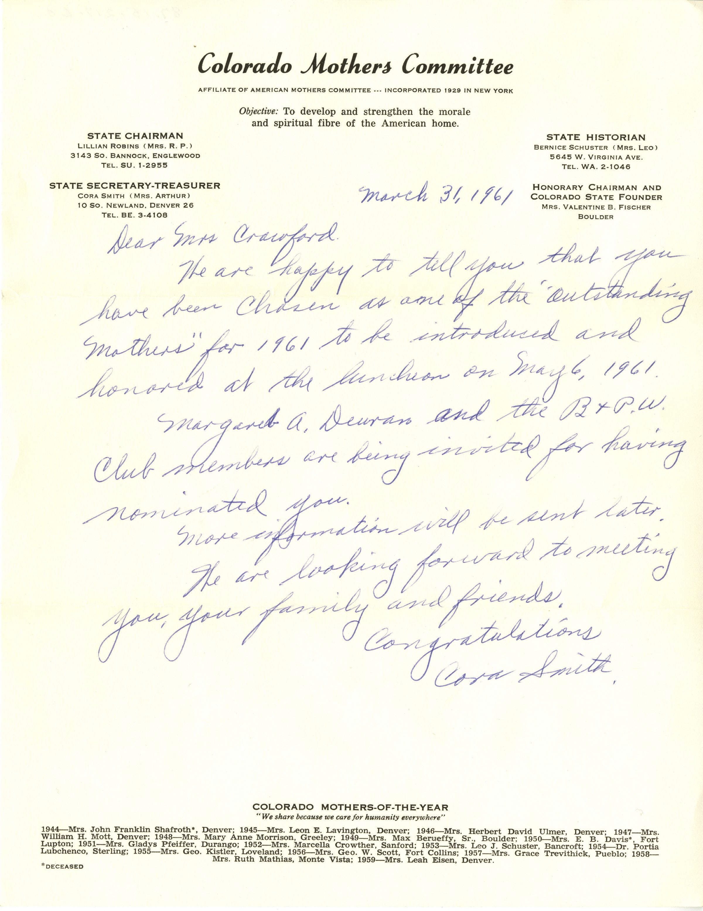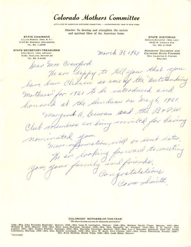 A handwritten letter from the Colorado Mother's Committee congratulating Mrs. Crawford on being chosen as an "Outstanding Mother." Includes the date of the luncheon and the names of those who nominated Mrs. Crawford. Signed by Cora Smith, State Secretary-Treasuerer.