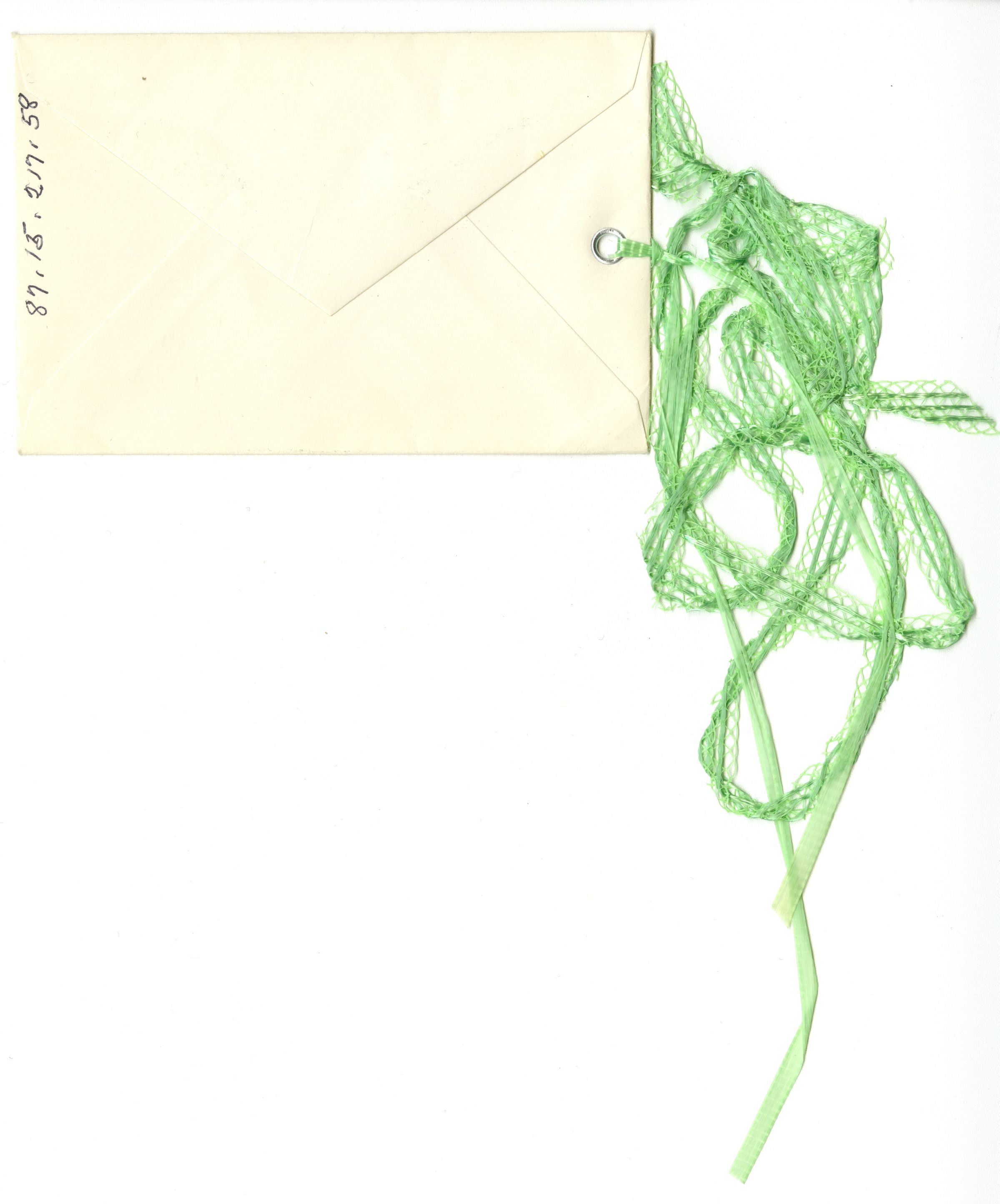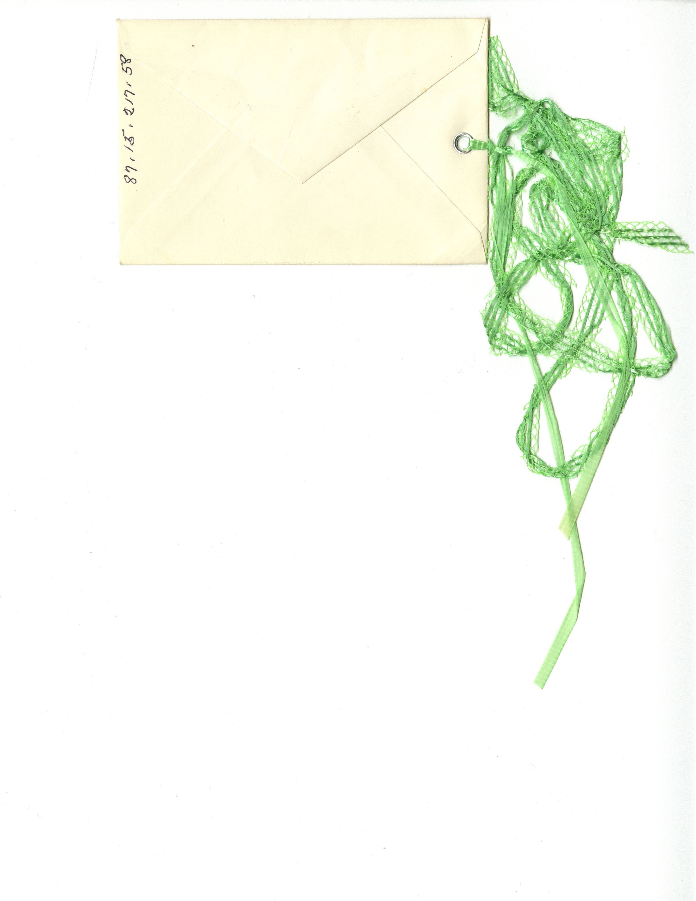 Green ribbon is attached to the left hand side of the envelope.