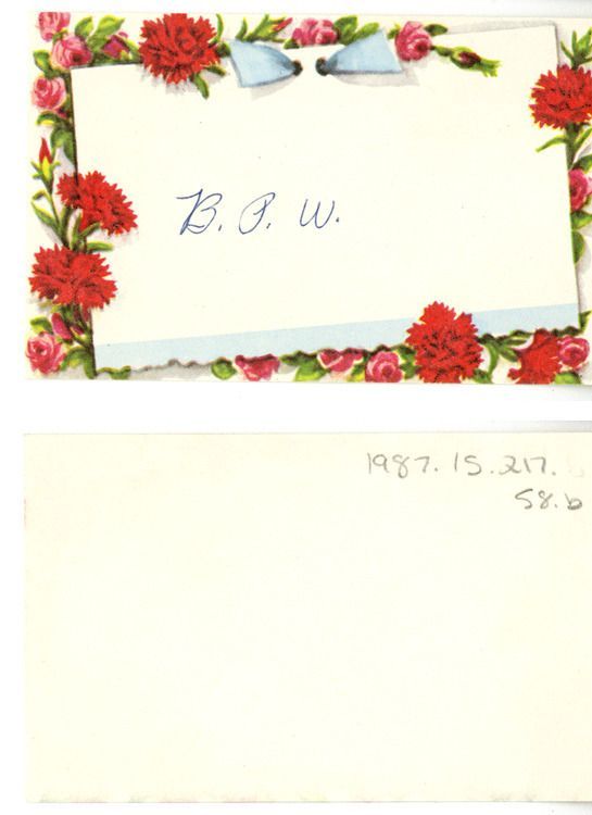 b: Card has a floral border. Handwritten initials B.O.W.