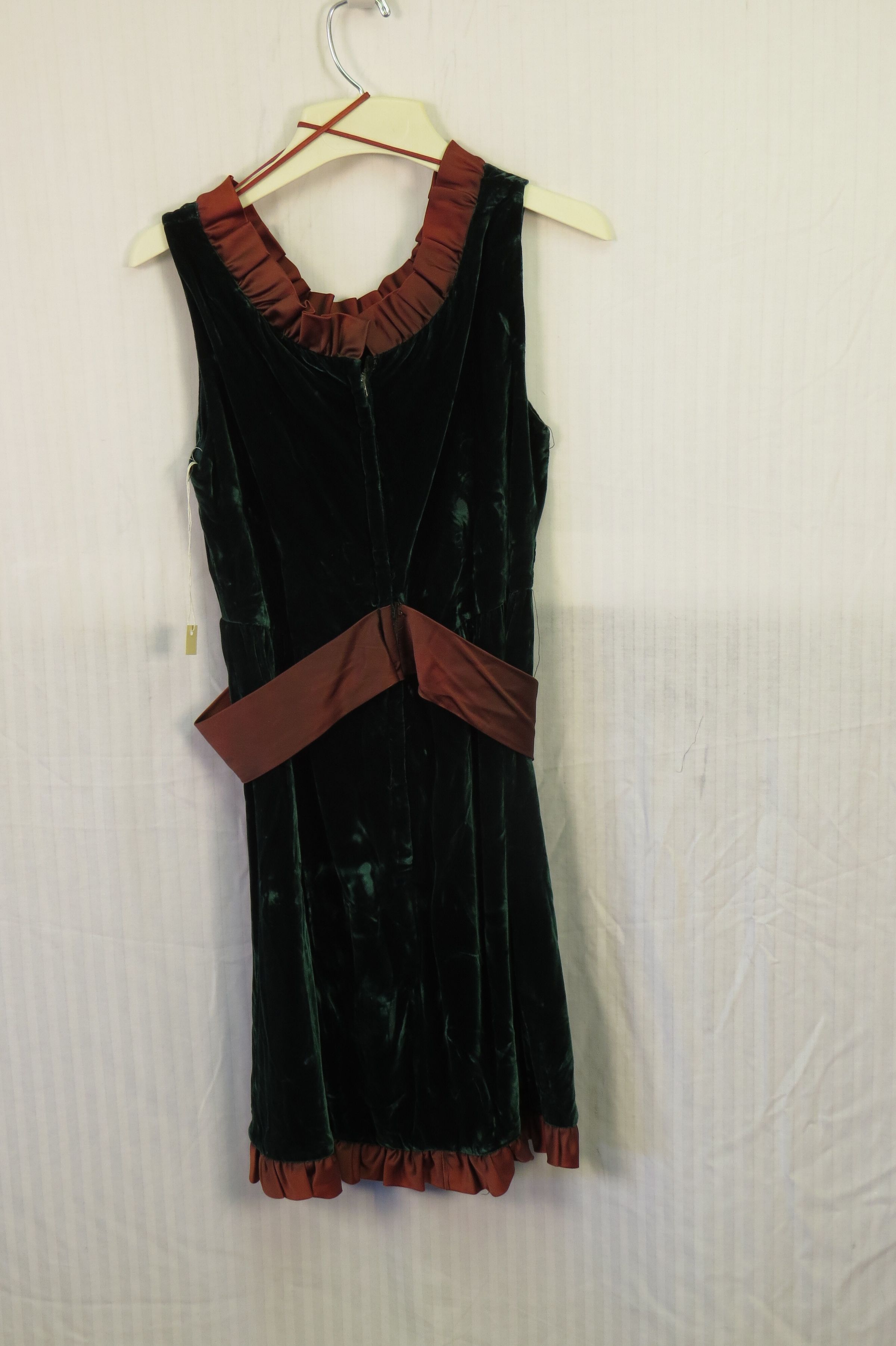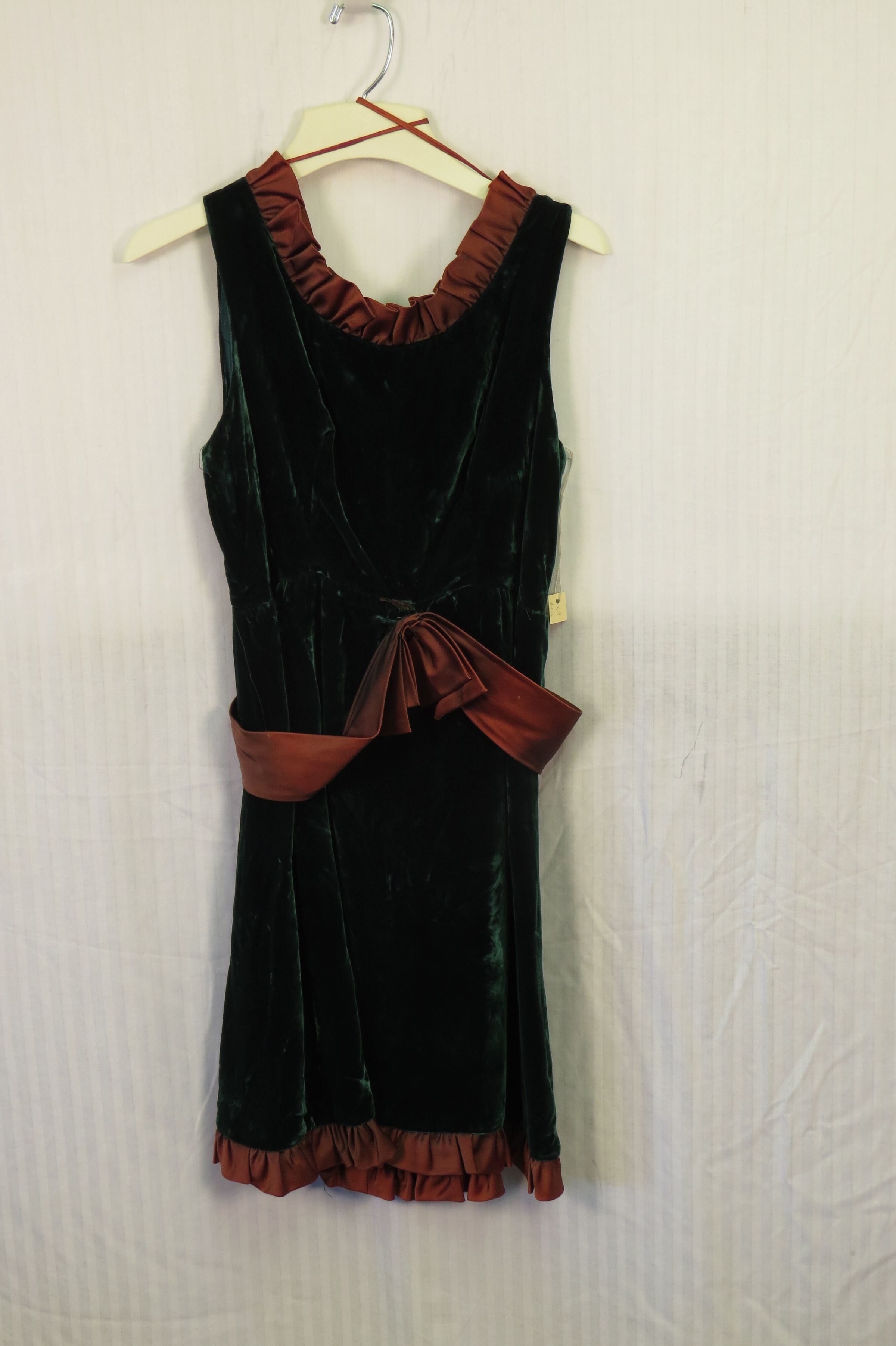This is a green velvet sleeveless dress with a gathered brown fabric at the neck and the hem and a brown sash at the waist. The dress measures 32" (l). Note: This was recommended for disposal by Megan Huelman in October 2013 (TTempleman 06/30/2017).