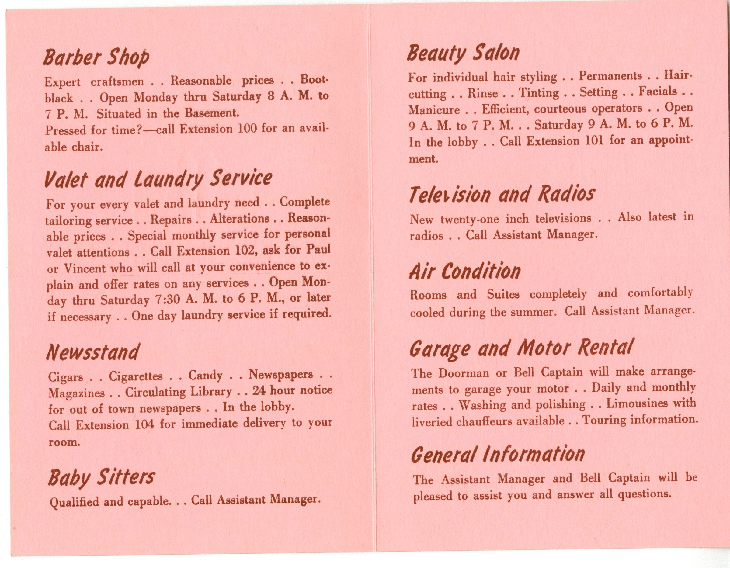 Inside covers Barber Shop, Valet and Laundry Service, Newsstand, Baby Sitters, Beauty Salon, Television and Radios, Air Condition, Garage and Motor Rental, and General Information.