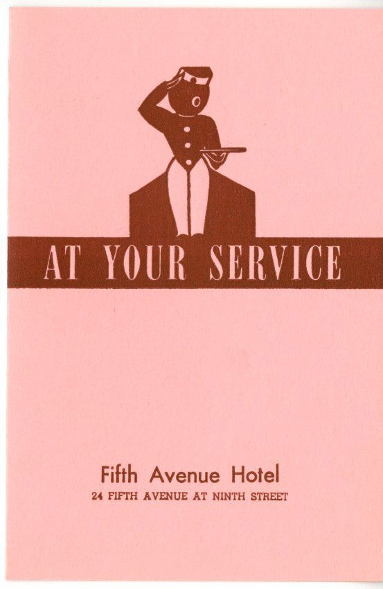 Cover is pink, with red ink. "At Your Service" with a figure of a waiter and the hotel's address.