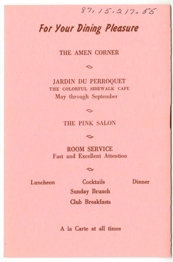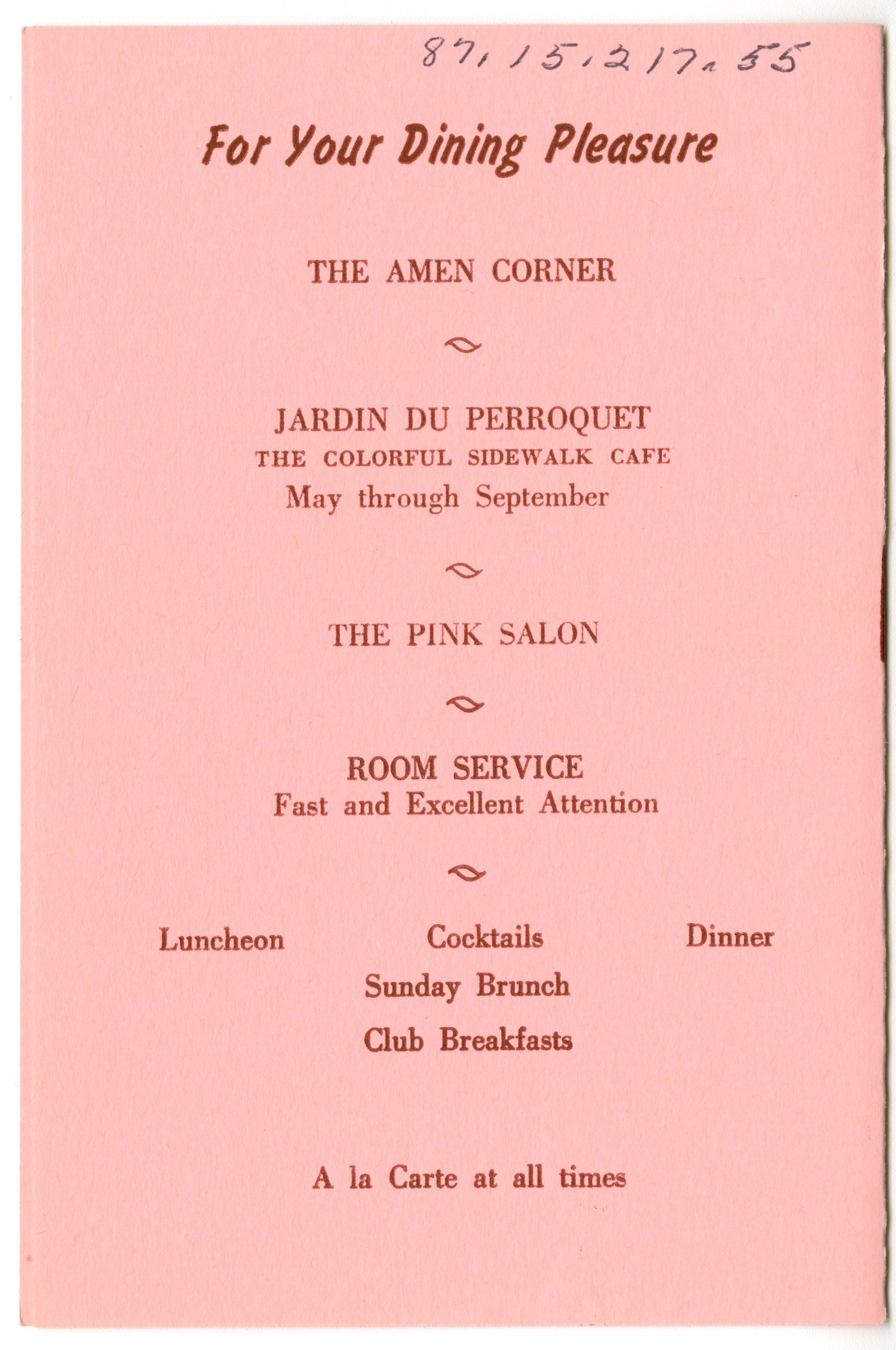 Back "For Your Dining Pleasure" and lists three restaurants and the Room Service.Collection