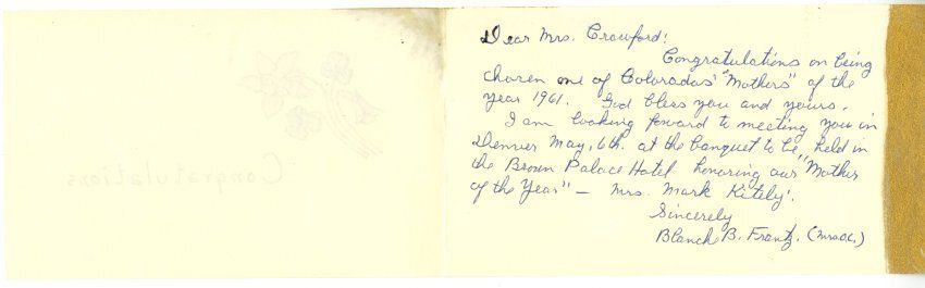 Congratulatory letter to Mrs. Crawford for her being chosen as an Outstanding Mother from Mrs. Frantz.