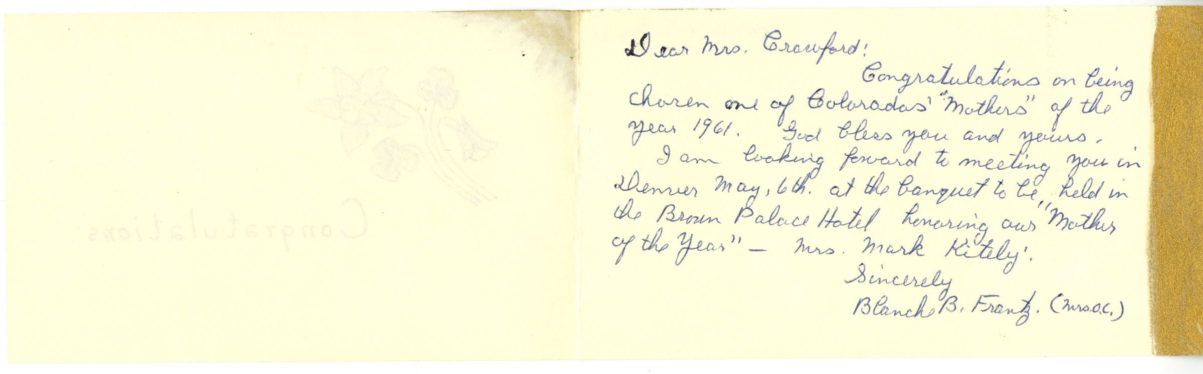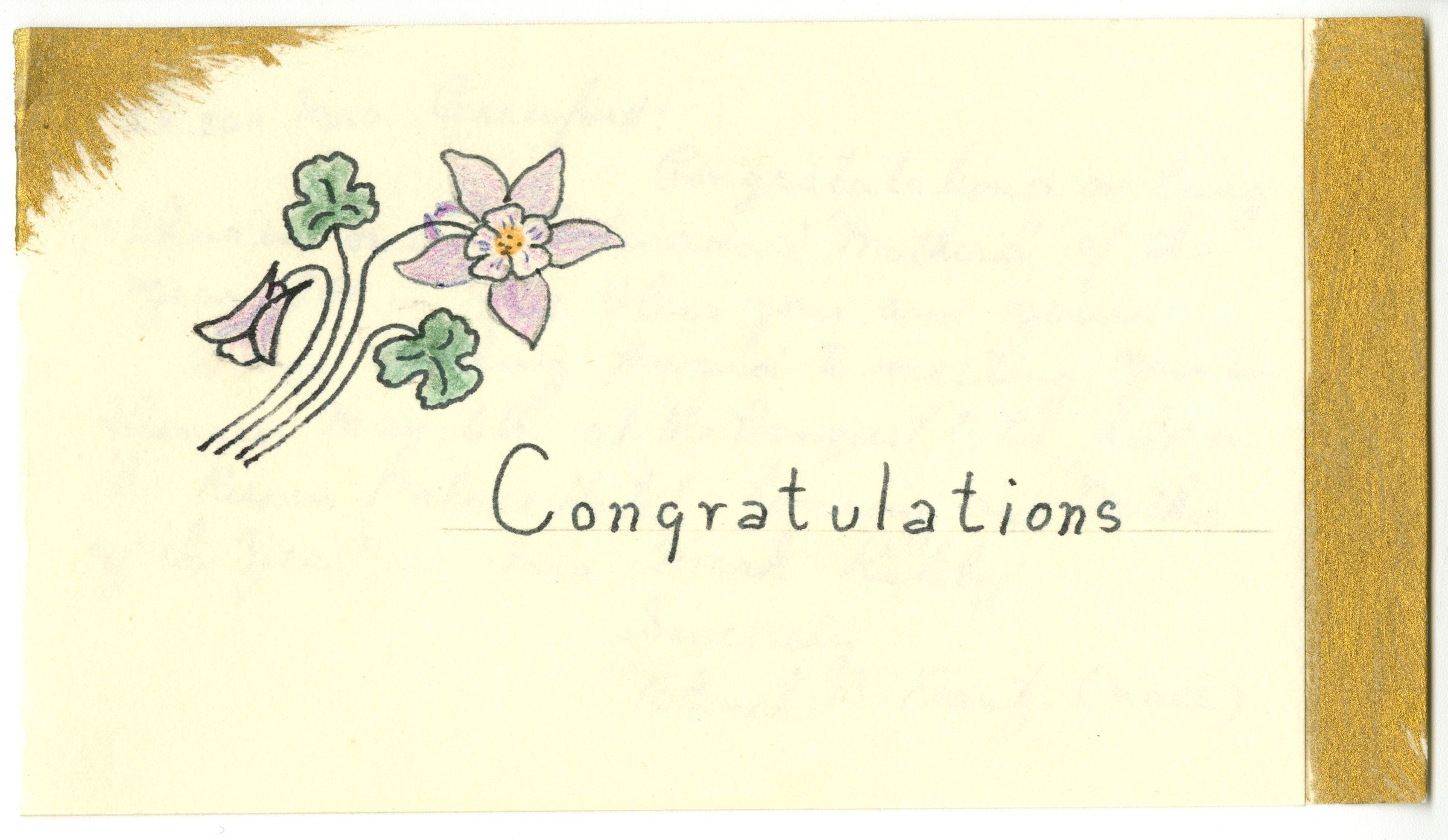 b: Letter. Columbine flower drawn on the front with the word "Congratulations" and a gold splay in the top left corner and a gold border on the right edge. Letter opens and is handwritten by Blanche B Frantz (Mrs O.C.)Collection